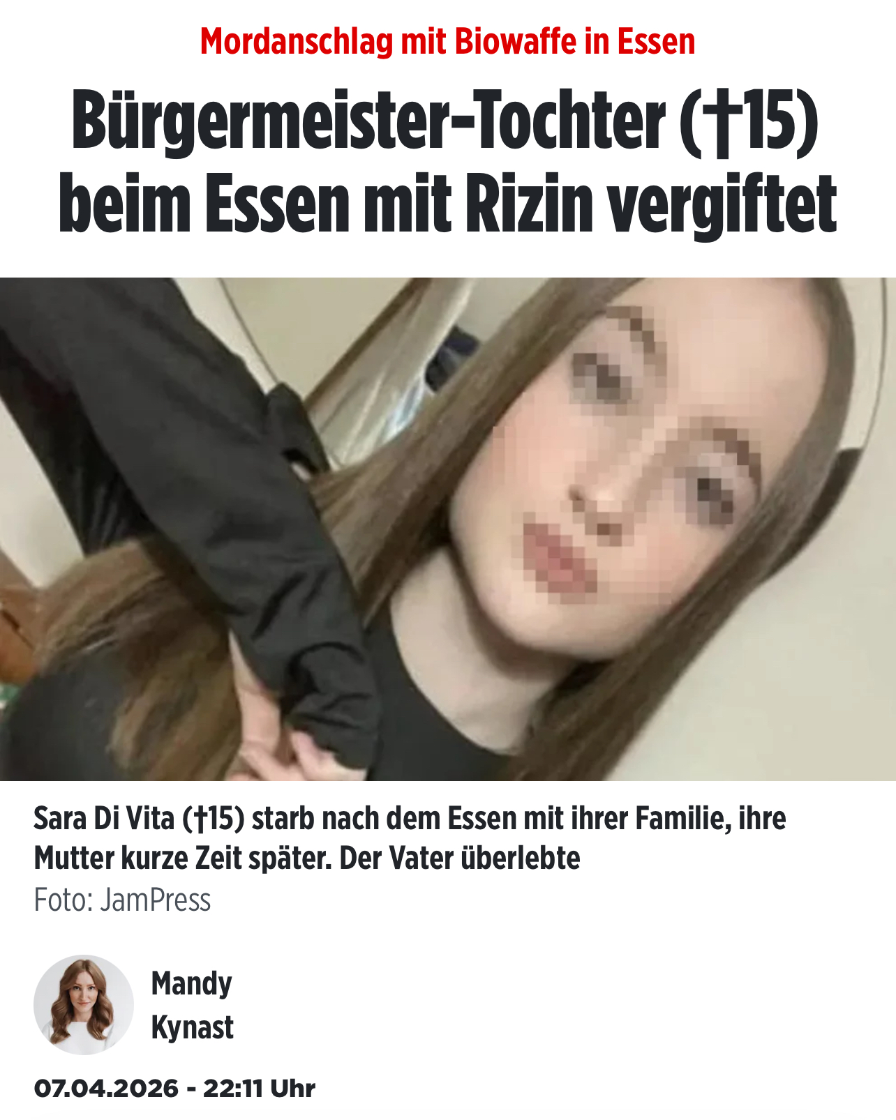 Spuren des Gifts, das als Biowaffe gilt, seien im Blut von Sara und in einem Haar ihrer Mutter Antonella gefunden worden, teilte die Polizei mit. Rizin ist nur schwer nachweisbar, dafür umso tödlicher. Bereits eine Prise des Pulvers reicht aus, um die Organe eines Menschen versagen zu lassen. Die Staatsanwaltschaft ermittelt nun wegen zweifachen Mordes gegen Unbekannt.