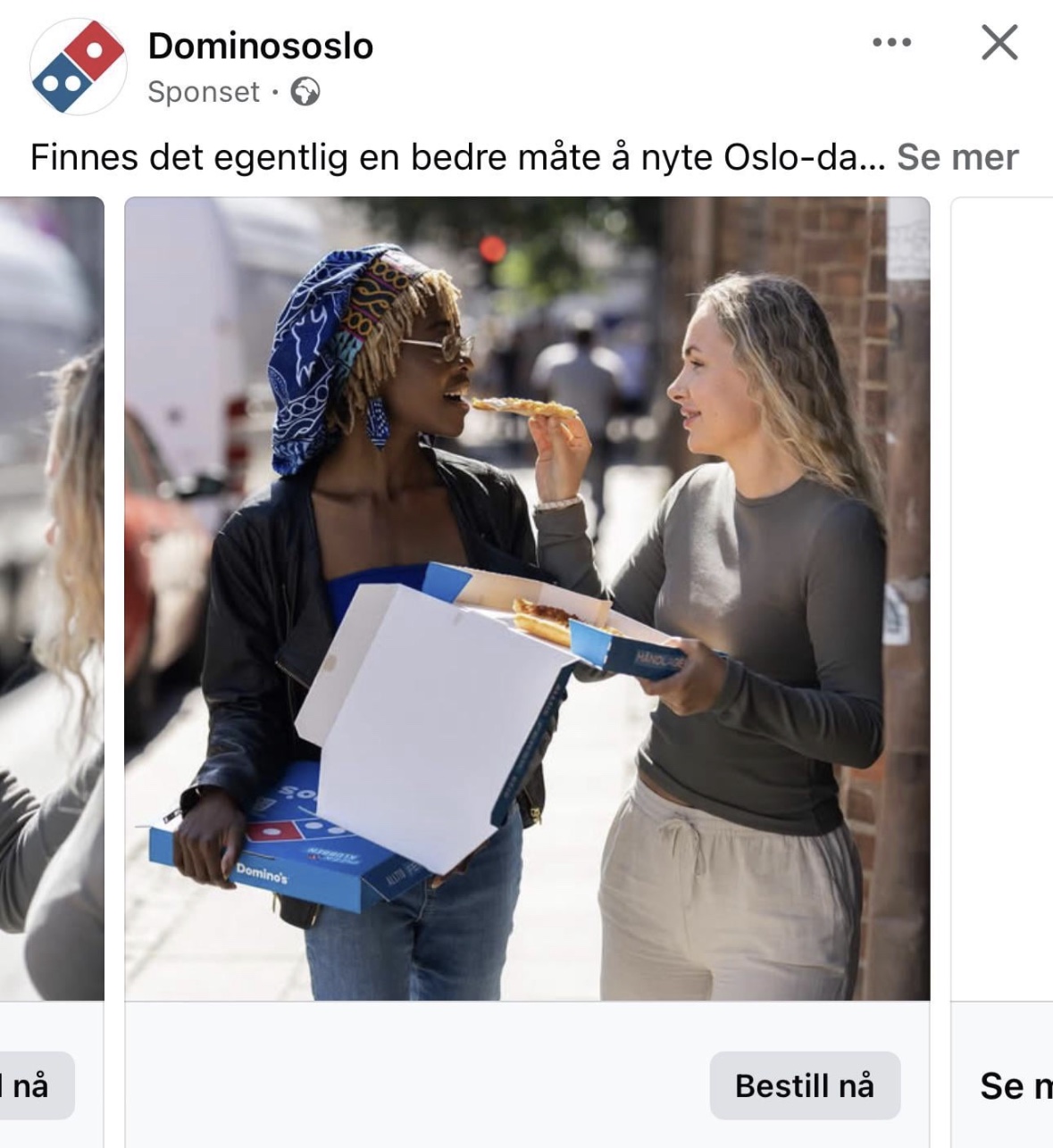 Så dominos har altså mer fokus på huden på andre sine neser en pizza? Her viser de to stykker som ser rett på de flotte nesene til hverandre mens hun klarer jo faen ikke spise selv en gang, må bli matet. Hva er dette for noe dominos? Er det ikke pizza man skal fokusere på?