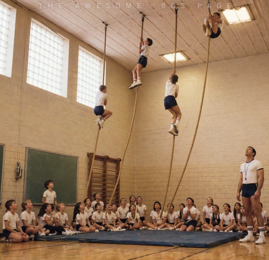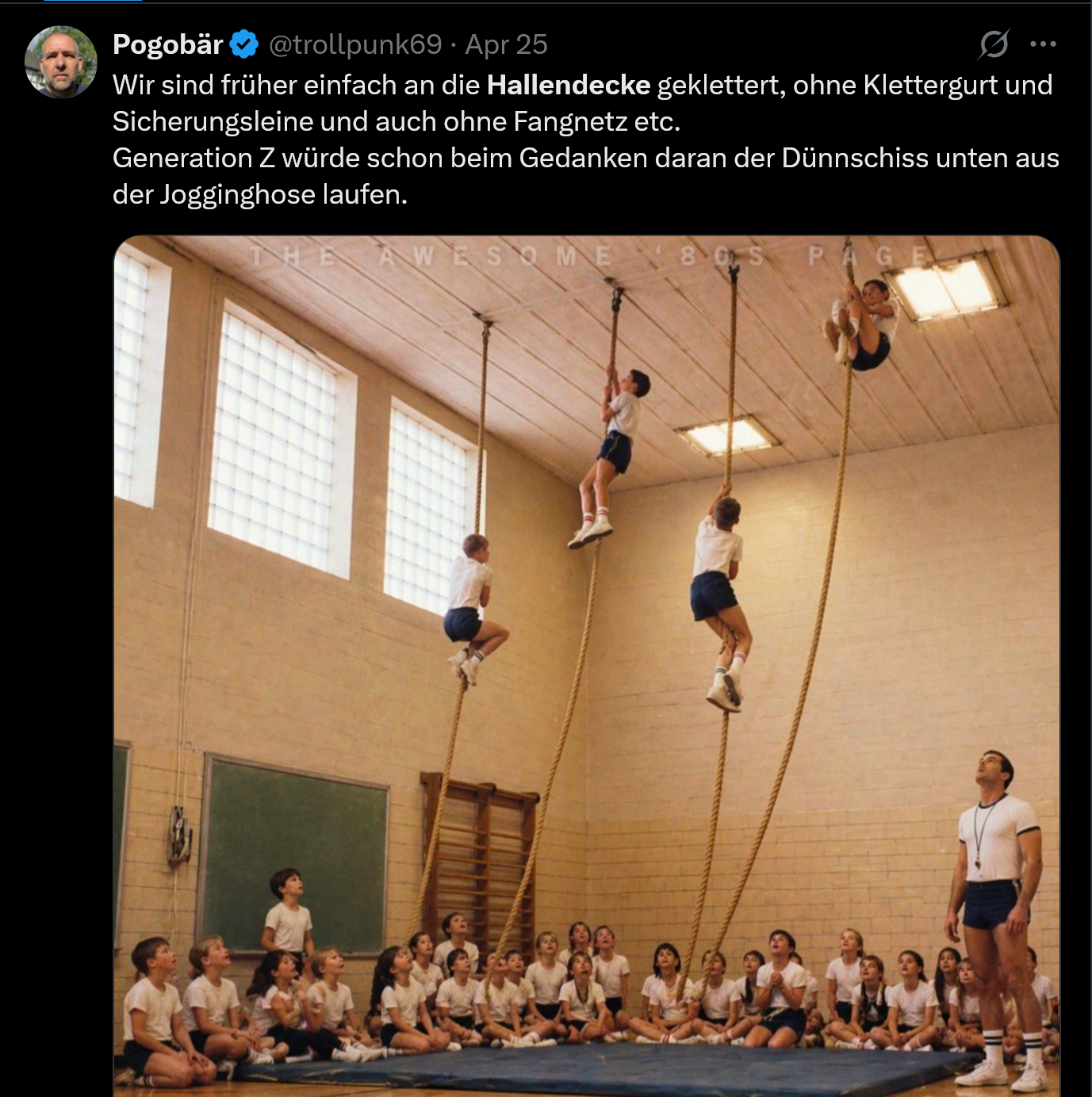Wir sind früher einfach an die Hallendecke geklettert, ohne Klettergurt und Sicherungsleine und auch ohne Fangnetz etc.Generation Z würde schon beim Gedanken daran der Dünnschiss unten aus der Jogginghose laufen.