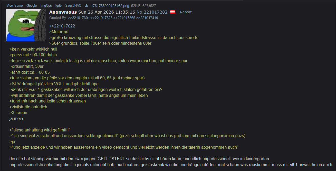 >>221029353100 in ner 50er Zone innerorts = lappen weg.danke fürs mitspielen kek.