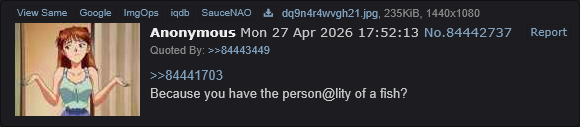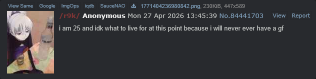 >>221065760True>fishcelhttps://desuarchive.org/_/search/boards/int.r9k/image/ZKV9-gd8ByXesSkYYAsTkg/Not sure if it's really him. He seems a lot more negative than he used to be but his typing style is pretty consistent so maybe he's just having a rough time.>>221065791yeah :)