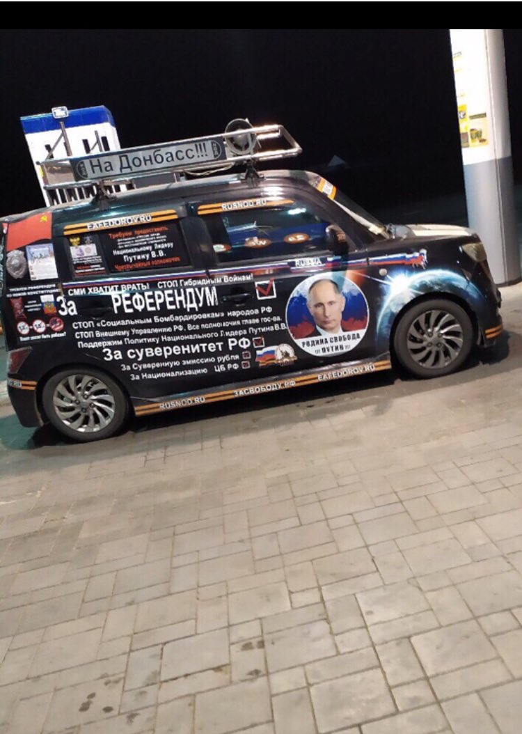 this one is interesting... he's probably white and educated, but he decides to put the russian flag right next to a big peace sign... interesting statement