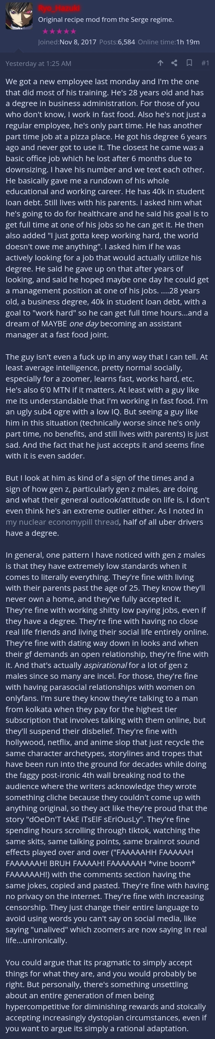 >>221057177I live in a beautiful 120 square meter apartment with cafes right across the street.Having to venture out into Manhattan to wagie is an exercise in masochism. Staying home and eating right and grooming myself is a privilege. Getting along with my mom enough that she allows me to take a break is another one. And having a friend to buy beers for me is yet another one.I don't understand how I am making the mentally ill decision when I have a support network to look after me when I am gainfully unemployed. Waging is not liberation it's a struggle that I only have tk take part in once in awhile.Once I get a median income job and move out I will already be successful vy new york standards. Mindlessly waging isn't going to save you in this city. It'll drive you mad and bring out the worst in you.