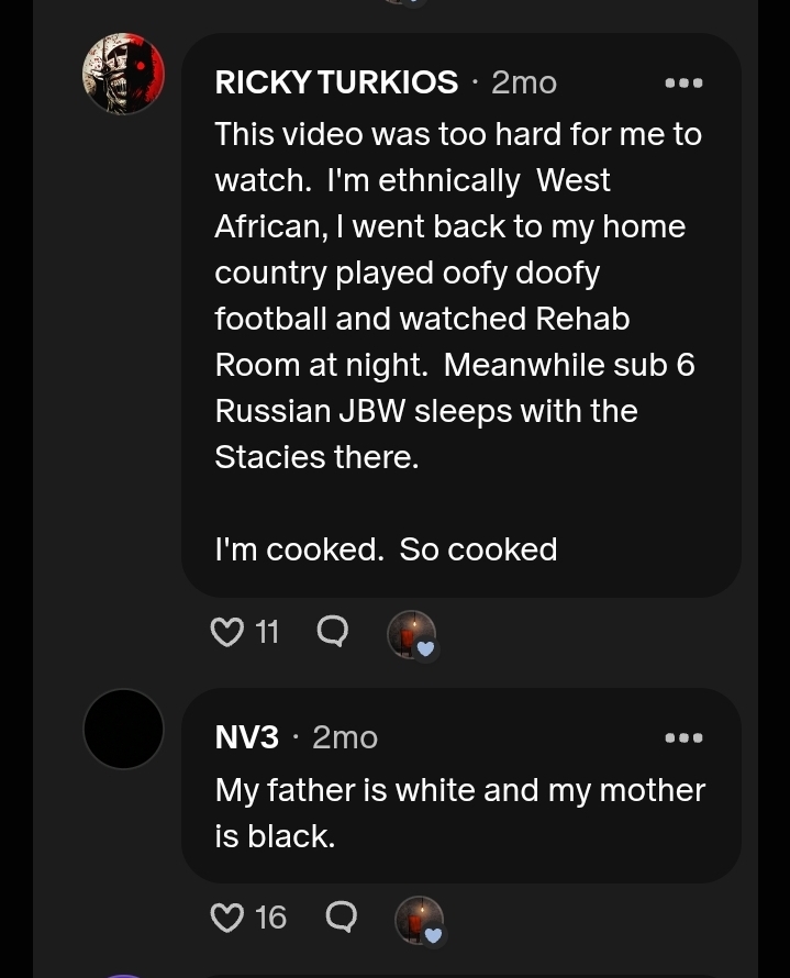 >>221063201That's American blacks with american men i am talking about geomaxxing to sleep with nigger babies and anyway white men have the highest SMV and black women have the lowest SMV in their respective sex so there is your answer.>>221063219You can't stop a coper from coping.