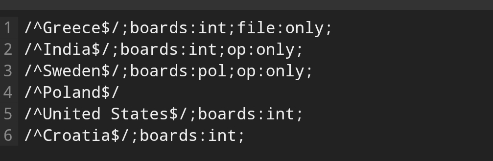 This kills balk btw:/^Greece$/;boards:int;file:only;/^India$/;boards:int;op:only;/^Sweden$/;boards:pol;op:only;/^Poland$//^United States$/;boards:int;/^Croatia$/;boards:int;