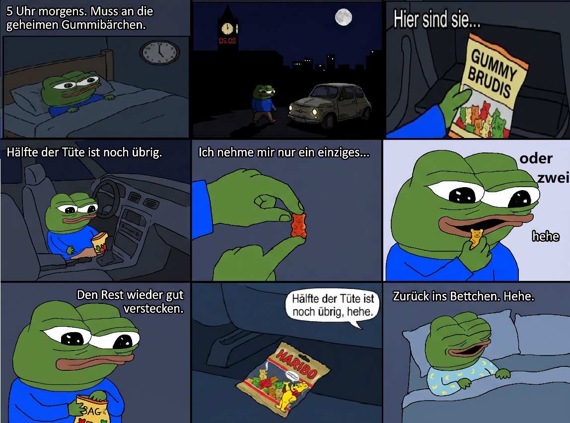Hab noch im Auto Gummibärchen versteckt, damit ich die alle nicht auf einmal aufesse. Hälfte der Tüte ist noch übrig, hehe.