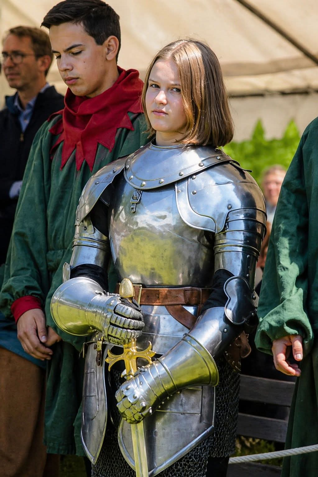 Voici Clotilde Forgeot d'Arc, qui incarne Jeanne d'Arc lors des célébrations traditionnelles de la levée du siège d'Orléans en 1429.On la présente souvent comme une descendante de Pierre d'Arc, frère de Jeanne, bien que cette filiation soit contestée. Jeanne, quant à elle, n'eut pas d'enfants.Elle est vêtue d'une armure complète, évoquant l'aura historique de l'héroïne française. L'événement mêle éléments modernes et médiévaux, soulignant l'héritage durable de ce siège historique.---Elle est mignonne, non ?