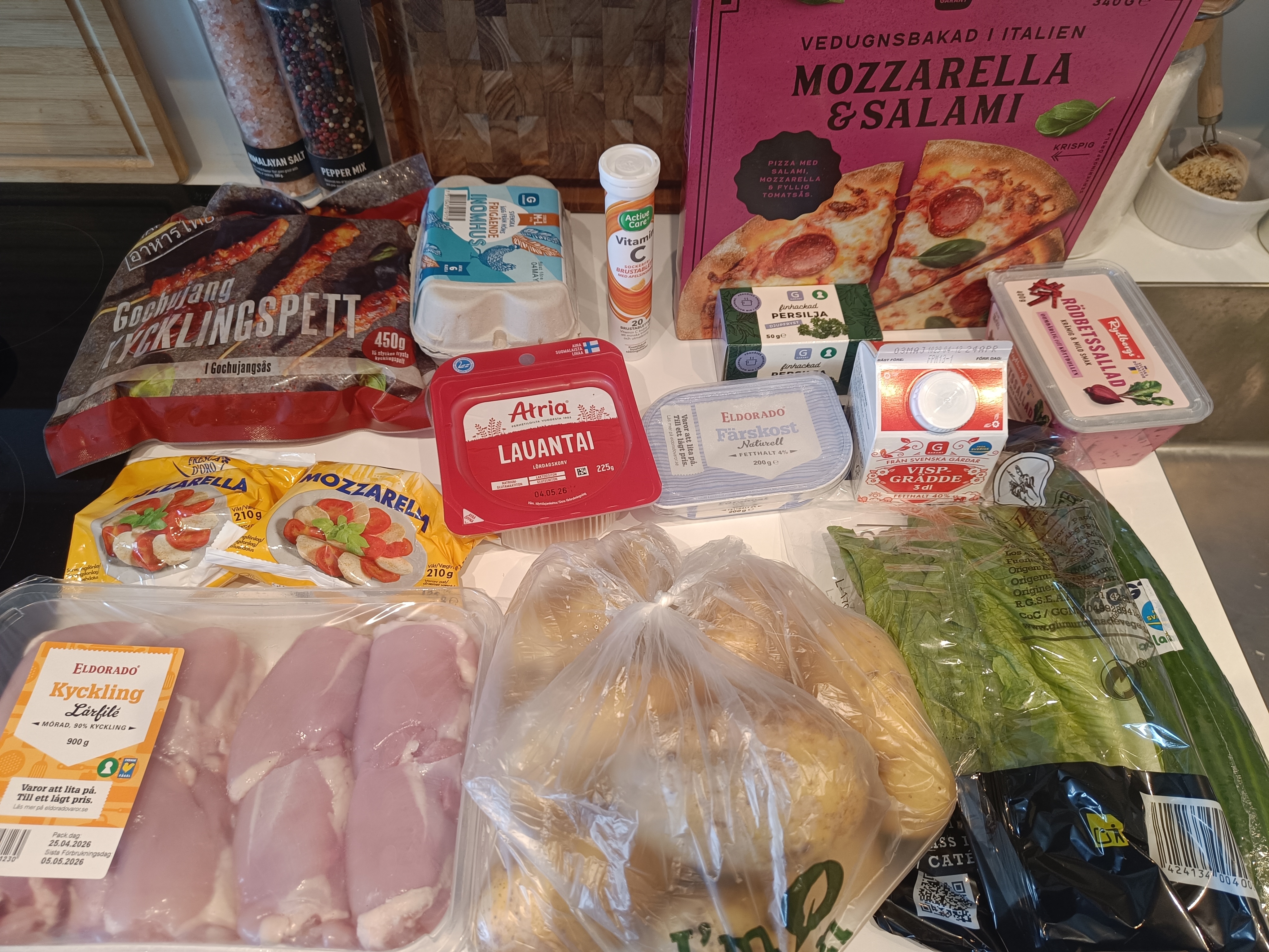 bokstavligen allt där förutom äggen, vispgrädden och pizzorna (på min rekommendation) är bajs