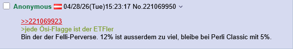 >>221069923>jede Ösi-Flagge ist der ETFlerBin der der Felli-Perverse. 12% ist ausserdem zu viel, bleibe bei Perli Classic mit 5%.