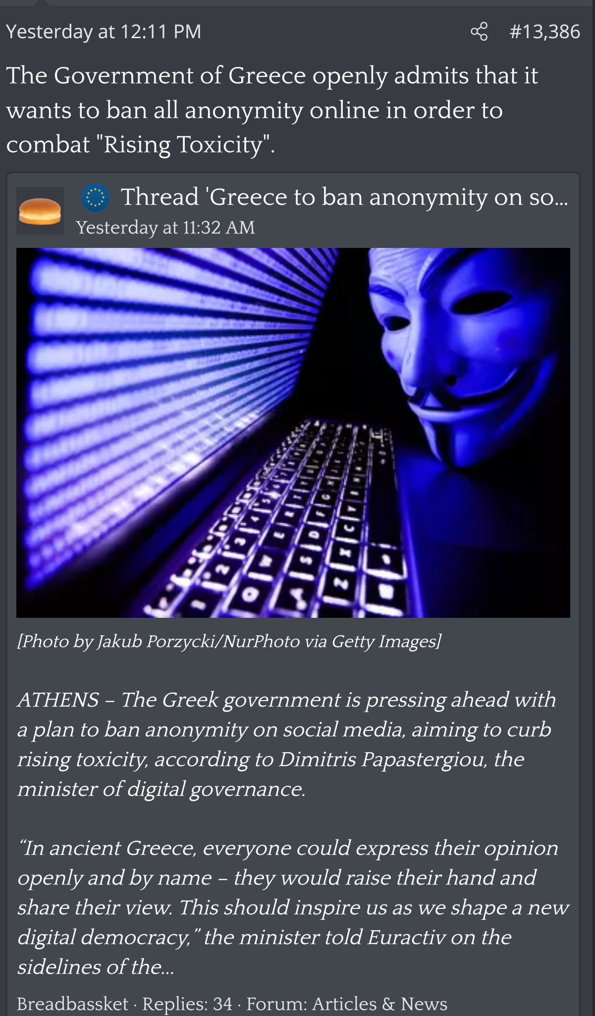 >>221090078mitsoturkakis, like the good liberal goy he is, awaits an eu wide legislation that will allow him to enforce his Gestapo ways on the populace without hindrance Given the fact his lackey jumped the gun and withing mere 20 days of the initial announcement they openly said it's not about the kids, it's because anonymity annoys them, they inadvertently gave more fire the majority of eu govs that don't want ithttps://www.politico.eu/article/national-capitals-cool-brussels-age-check-app-social-media-children/