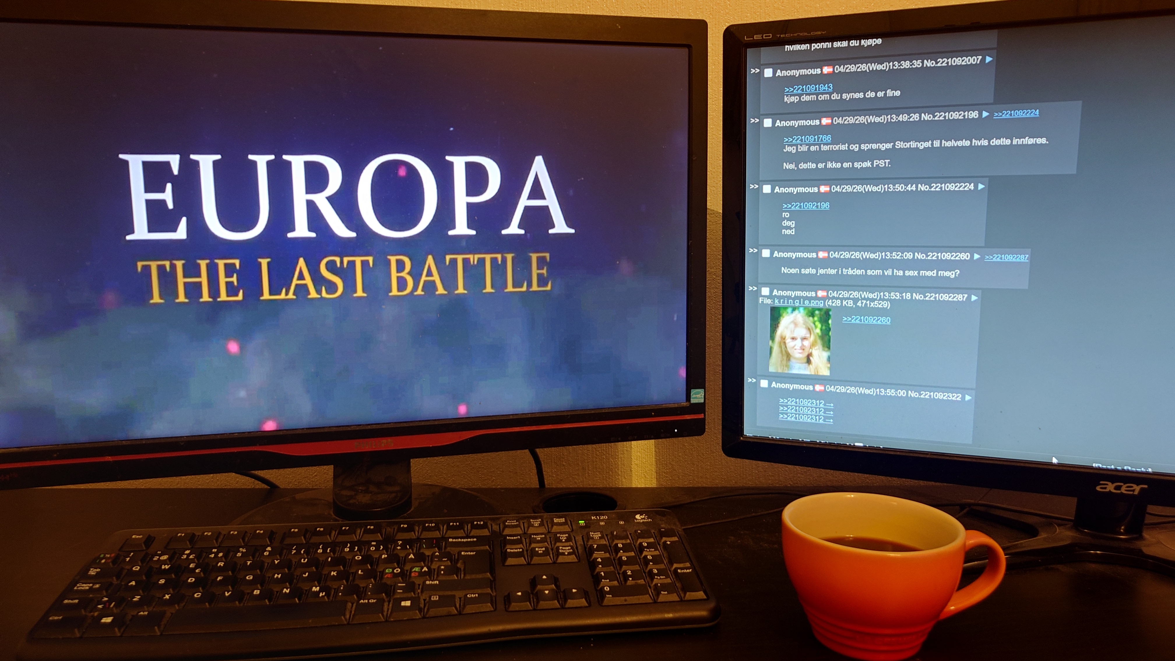 Drikker kaffe, ser film og leser tråd.