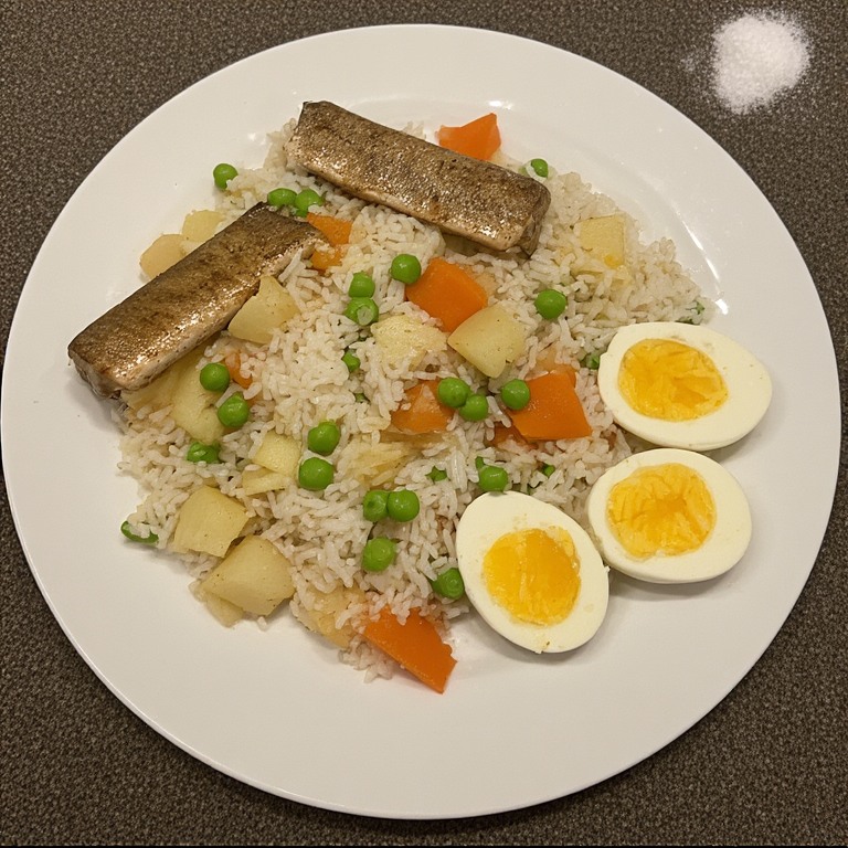 I like rice with peas, pieces of boiled potato and pieces of boiled carrots and 2 split boiled eggs with salt on the side.