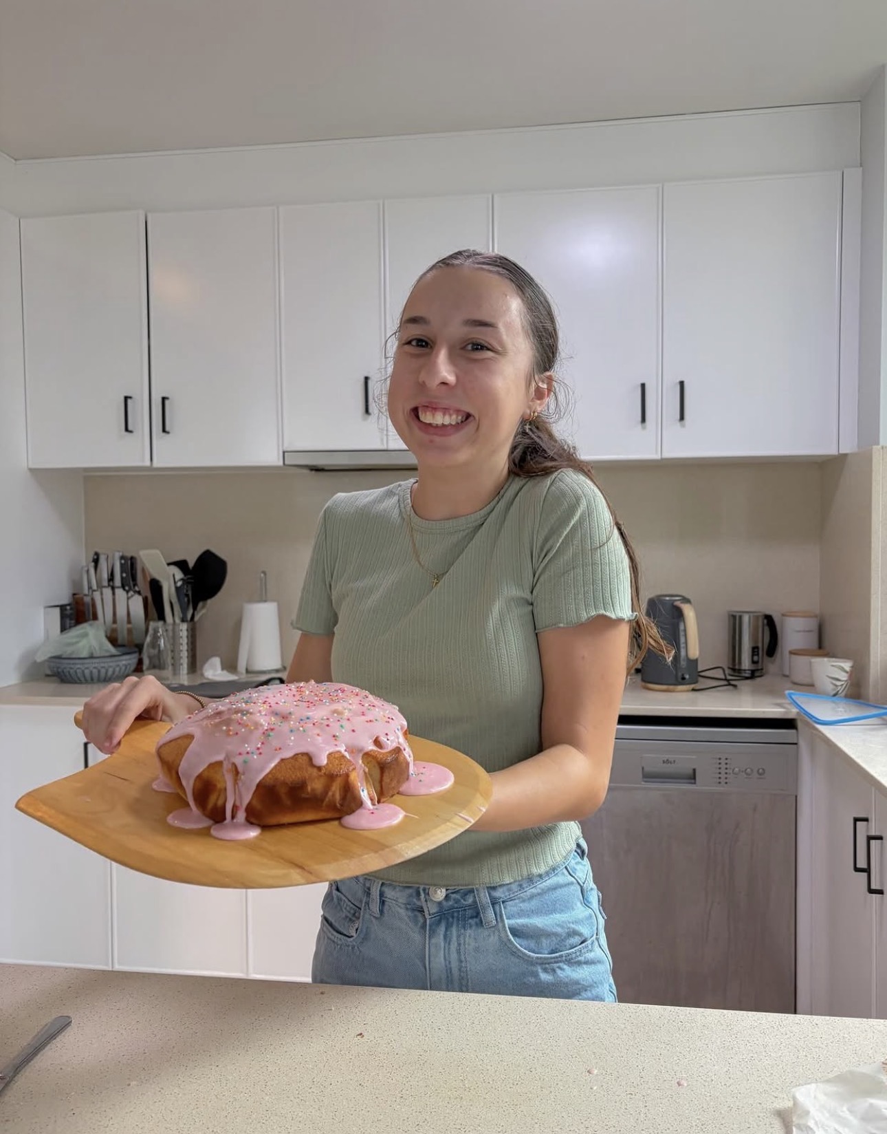 The image is a medium-shot, vertical portrait of a smiling young person standing in a bright kitchen, holding a large cake on a wooden board. The subject has dark hair tied back in a ponytail and is wearing a light sage green ribbed short-sleeved shirt and blue denim jeans. They are positioned centrally behind a kitchen counter, holding a circular wooden peel or cutting board with both hands, tilted slightly toward the camera. On the board sits a round, golden-brown cake topped with thick pink icing that drips down the sides and is decorated with multicolored sphere sprinkles. The kitchen background is modern and minimalist, featuring matte white cabinetry with black vertical handles. To the left, a knife block and kitchen utensils are visible on the counter. In the background to the right, there is a blue electric kettle and a dishwasher integrated into the lower cabinetry. The lighting is bright and even, suggesting indoor artificial light or strong daylight. The overall composition is clean and centered, capturing a celebratory or domestic moment. The person has a wide, enthusiastic expression, displaying their teeth, and is wearing a thin gold necklace. The foreground consists of a neutral-toned countertop that creates a horizontal line across the bottom of the frame. The focus is sharp on the subject and the cake, with the background elements clearly visible but secondary in visual weight.