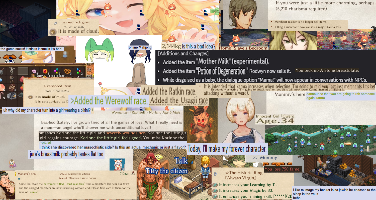 Beginner guide, FAQ and links: https://rentry.org/8vkaw - Multiple links in this rentry are dead or out of date, save us Anon!New child mechanics guide for Elona+: https://pastebin.com/7is8p4NFElona+ Custom-GX continued branch: https://github.com/JianmengYu/ElonaPlusCustom-GXExtra sprites/PCCs: https://elonaup.x0.com/sozai/index.htmElin Wiki: https://ylvapedia.wikiElin Player Guide-Compilation: https://ylvapedia.wiki/wiki/Elin:Player_GuidesElin Modding resources/code: https://github.com/Elin-Modding-Resources/Elin.Docshttps://github.com/Elin-Modding-Resources/Elin-DecompiledLewd sprites for Elin herehttp://amaebiworld.web.fc2.com/rkgk/elin/elin_replace.htmhttps://ci-en.dlsite.com/creator/32473/article/1558227Previous floor >>50802170