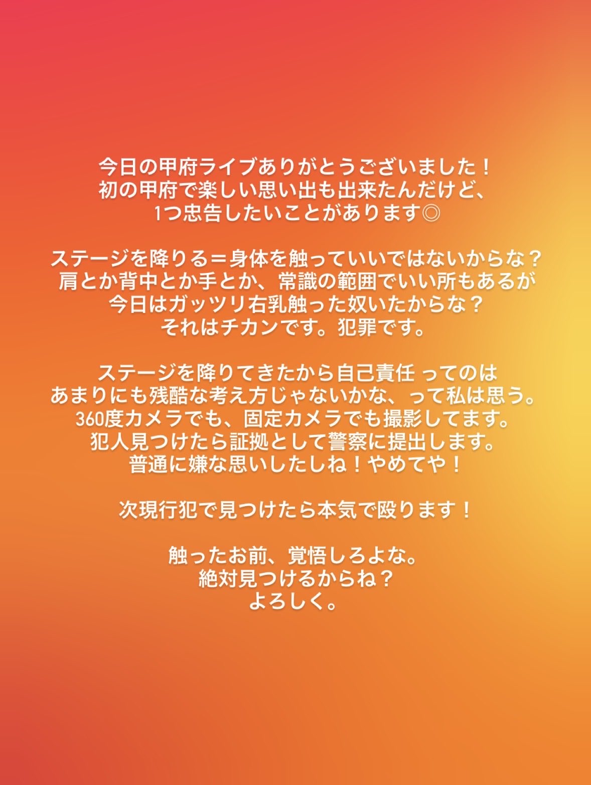 Apparently someone sexually assaulted Mayu at Nemophila’s live show in Kofu. She said someone groped her when she went off-stage into the crowd. I really hope whoever did it gets caught soon.>>50680998I've listened to one or two of their songs and liked what I heard. I think the first song you linked in particular is very fun. I’ll have to check out more of their stuff before I say much more, though.