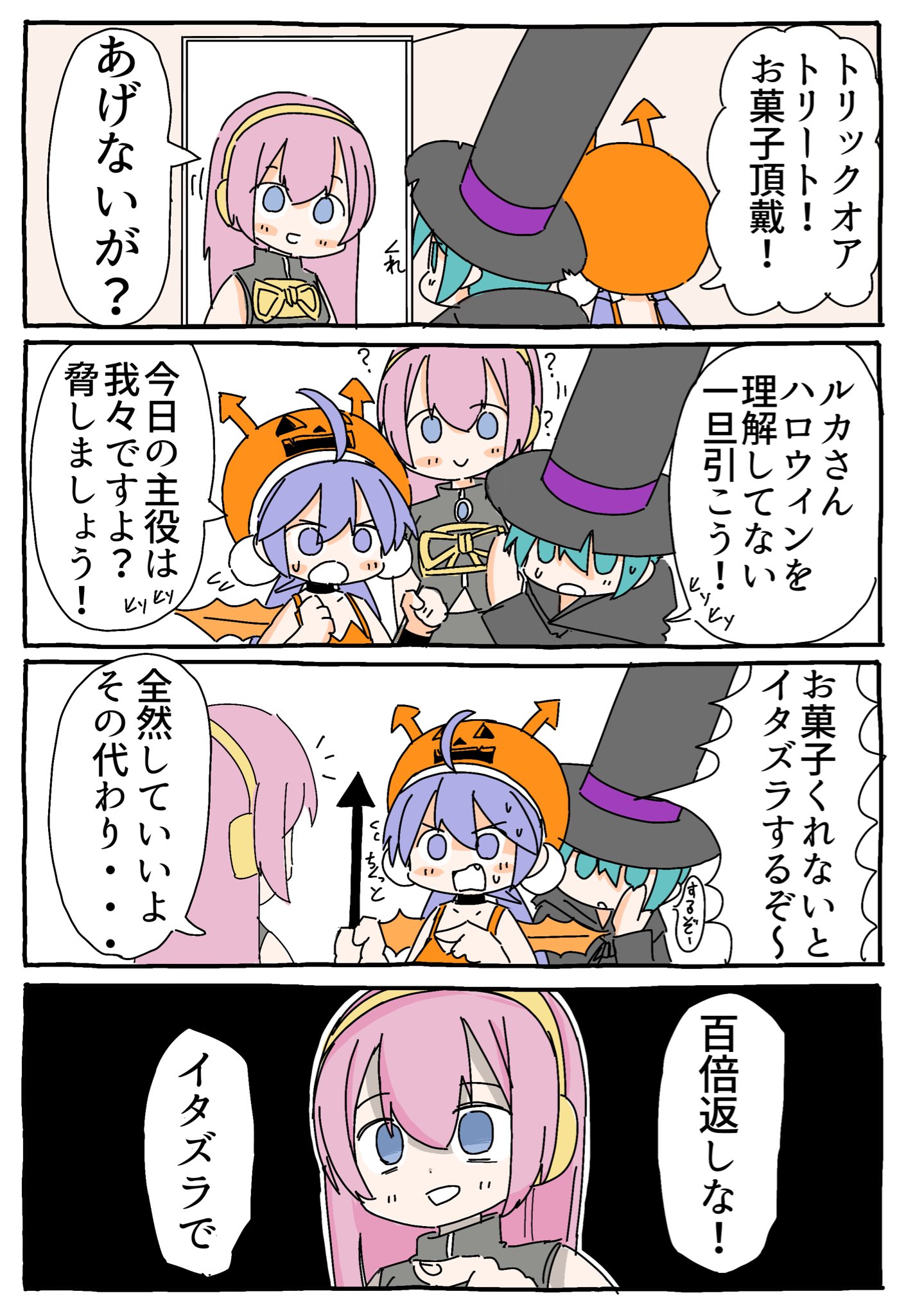 >>50237133tl attempt (if I got anything wrong please correct me)Una: Trick or treat! Give us candy!Luka: And if I don't?Miku: Luka-san doesn't understand Halloween. Let's retreat! (whispering)Una: We're the main characters today, y'know? Let's threaten her! (whispering)Una: If you don't give us candy we will play a trick!Miku: We will!Luka: I don't mind but in exchange...Luka: I will return the favor a hundred times! With tricks!