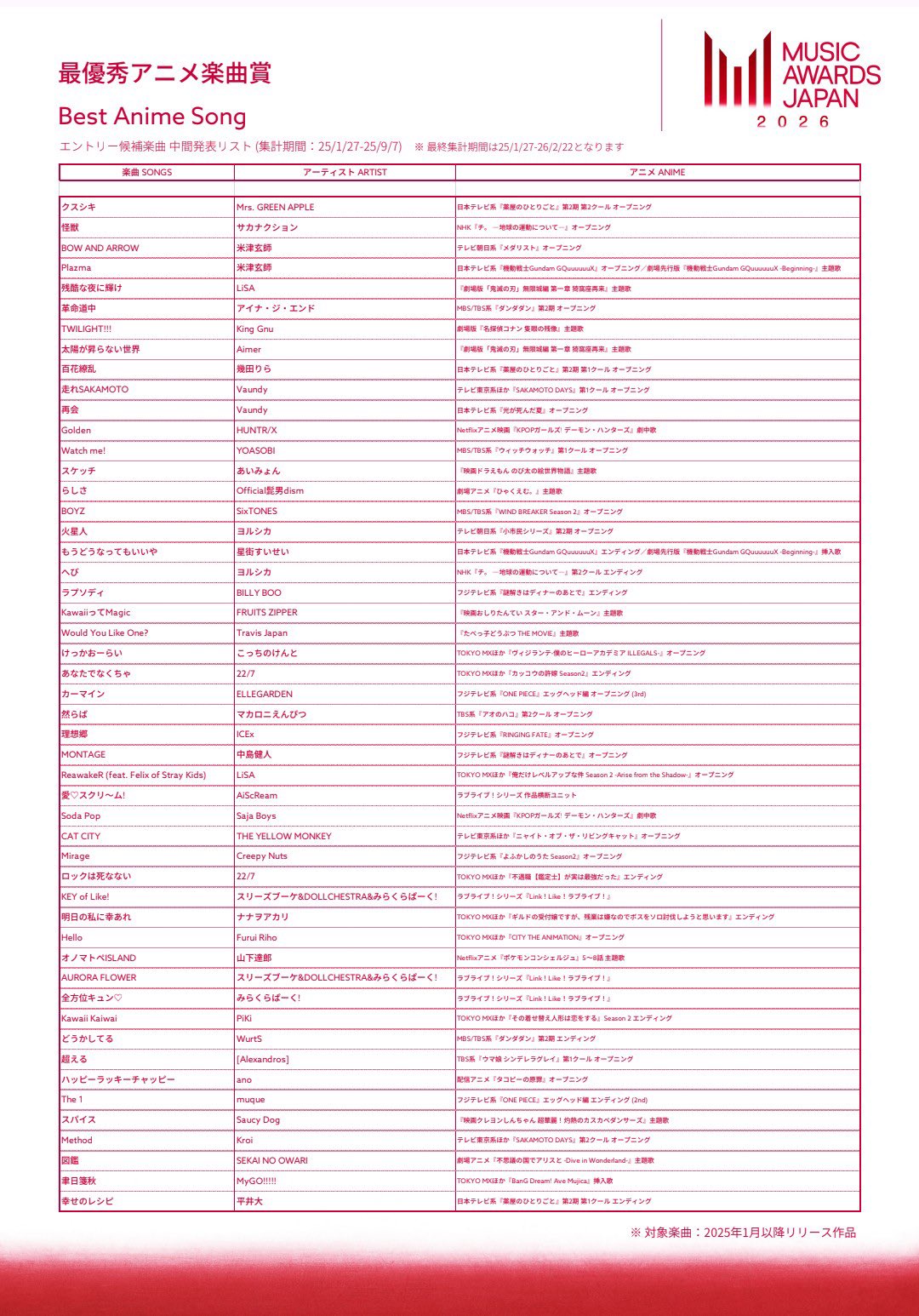 https://www.anisong-taisho.jp/>January 7, 2026Can't seem to find the nominees yet, unless they're only announcing them when the winners are announced.