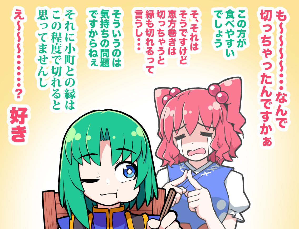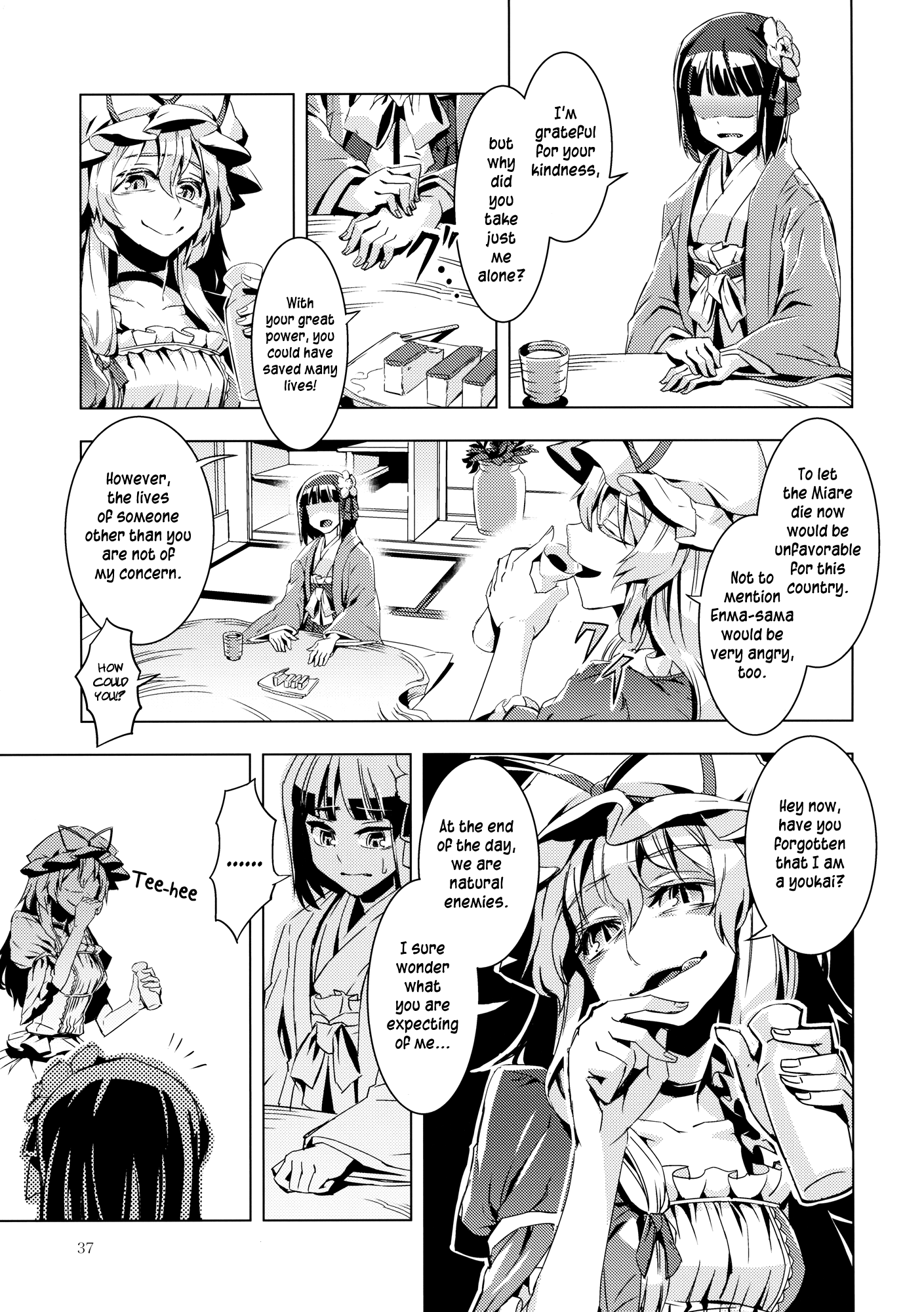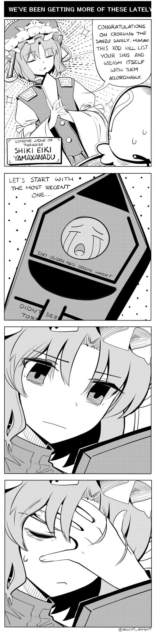 Eiki is such an interesting character. IIRC, shinigami with no job die, right? I think that means Eiki is willing to put up with Komachi’s shit because no other Yama would. She’s sacrificing a bit of her sanity to keep Komachi alive.