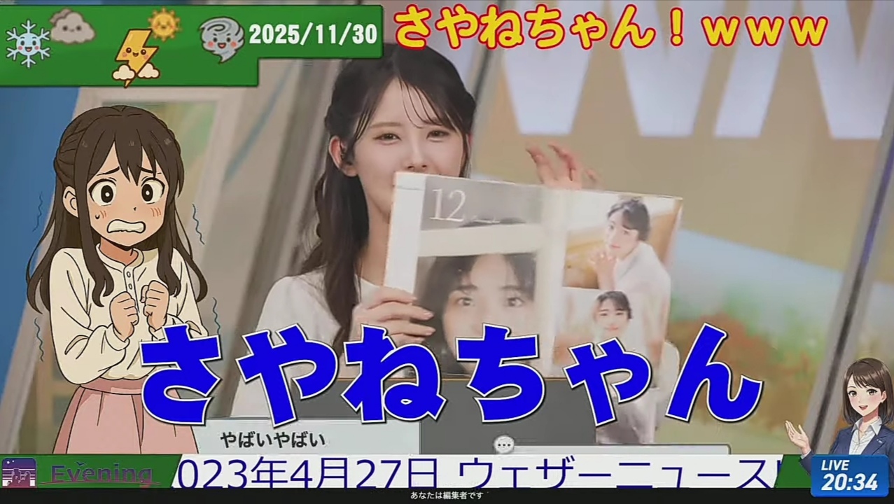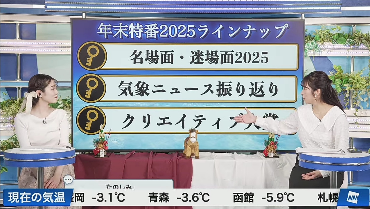 Chaotic Christmas Schedule and よこそう2026年 edition.前スレ >>50370605https://aqstream.com/jp -- TBS, NTV, NHK, Fuji TV, TV Asahi, TV Tokyo, etc. in browserhttps://gitflic.ru/project/utako/utako/ -- より良い画質で以上の局 + JSports and more for mpv/vlc usershttps://rentry.org/faaag_tv -- other media sourceshttps://seesaawiki.jp/announcer/https://mabui-onna.com/blog-category-7.html -- 最近のアナウンサーグラビアhttps://i.warosu.org/data/jp/img/0469/85/1717513390839664.jpg -- FLASHに依る2024お天気キヤスター総選挙https://pbs.twimg.com/media/Gskg8ifasAMzzU1?format=png&name=orig -- 2025お天気キヤスター総選挙>5chhttps://medaka.5ch.net/ana/ -- Announcer boardhttps://itest.5ch.net/agree/test/read.cgi/img8/1695243512/ -- /faaag/ outposthttps://github.com/JDimproved/JDim -- desktop client (Linux Native, Windows under WSL)https://%65%6E%64%63%68%61%6E.org/jp/res/1288.html -- より良い掲示板>ウェザーニュースhttps://m.youtube.com/@weathernewshttps://www.tiktok.com/@weathernewslivehttps://weathernews.jp/wnl/timetable.htmlhttps://smtgvs.weathernews.jp/a/solive_timetable/timetable.jsonhttps://rentry.org/faaaglookalikeshttps://surrit.com/8af8a961-e1d9-4d1c-b5a9-d4778f58870d/playlist.m3u8 -- blatant AV parodyhttps://getnavi.jp/entertainment/987167/ -- Interview with Sayane and Yukarin (to find the other ones, click on ウェザーニユース LiVE highlighted in red under the title)https://pta.vern.cc/caster-age.cgihttps://pta.vern.cc/nissin.html -- noodles and karaoke streamhttps://tensor.art/u/729905971123619975/models>schedule + sortable links to past WNL and AU Pay streamshttp://ggxx.sdf1.org/https://gg.vern.cc/wn/https://pta.vern.cc/wnc.cgihttp://sennajlwmhtxixl2qgwlvuaongxly6flffuz4roemsabjshlnnxdbbid.onion/https://jsfiddle.net/4ew2uqxj/2/ -- Browse AU Pay stream thumbnails>real footage of /faaag/gotshttps://surrit.com/6b24f028-bf898-47f3-80c3-36d24c506422/1280x720/video.m3u8