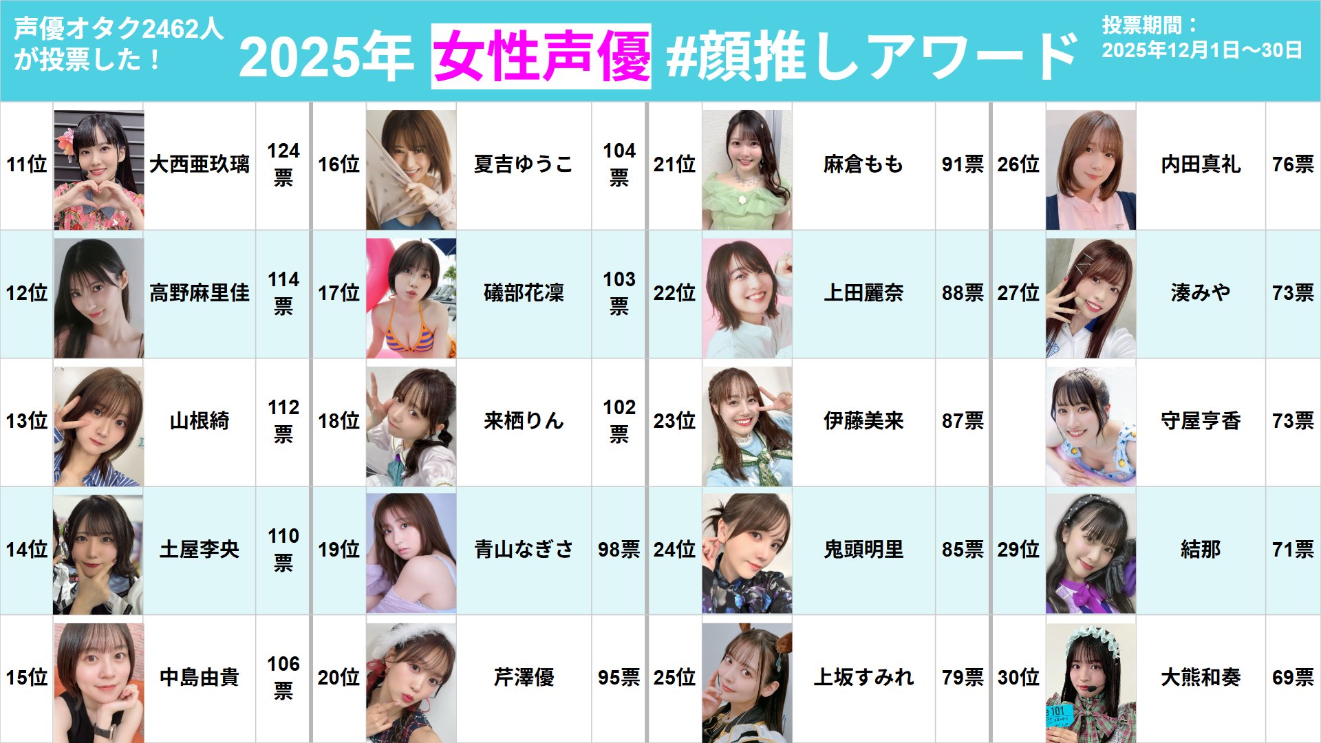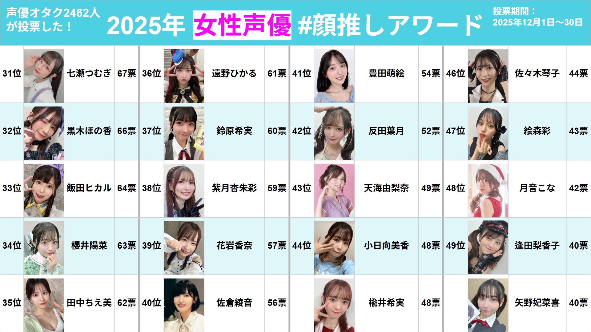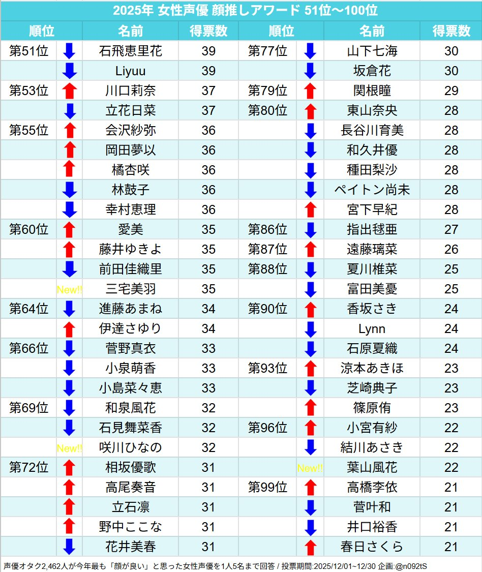 >>50519316some year-end seiyuu ranking a popular seiyuu fan account is doing every yearhttps://x.com/n092tS/