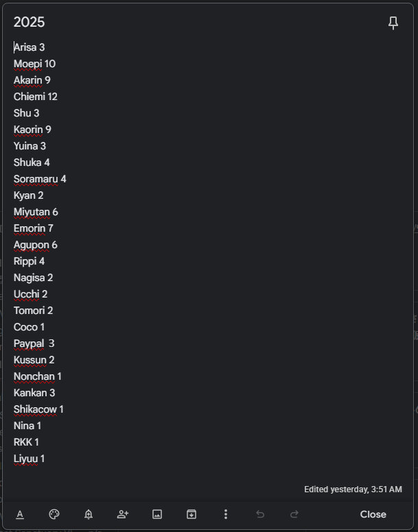 >>50520247emitsun2 rkk3tomori2 kuma2nagi2 kuma3(?)mayu3 ?homin2 ?