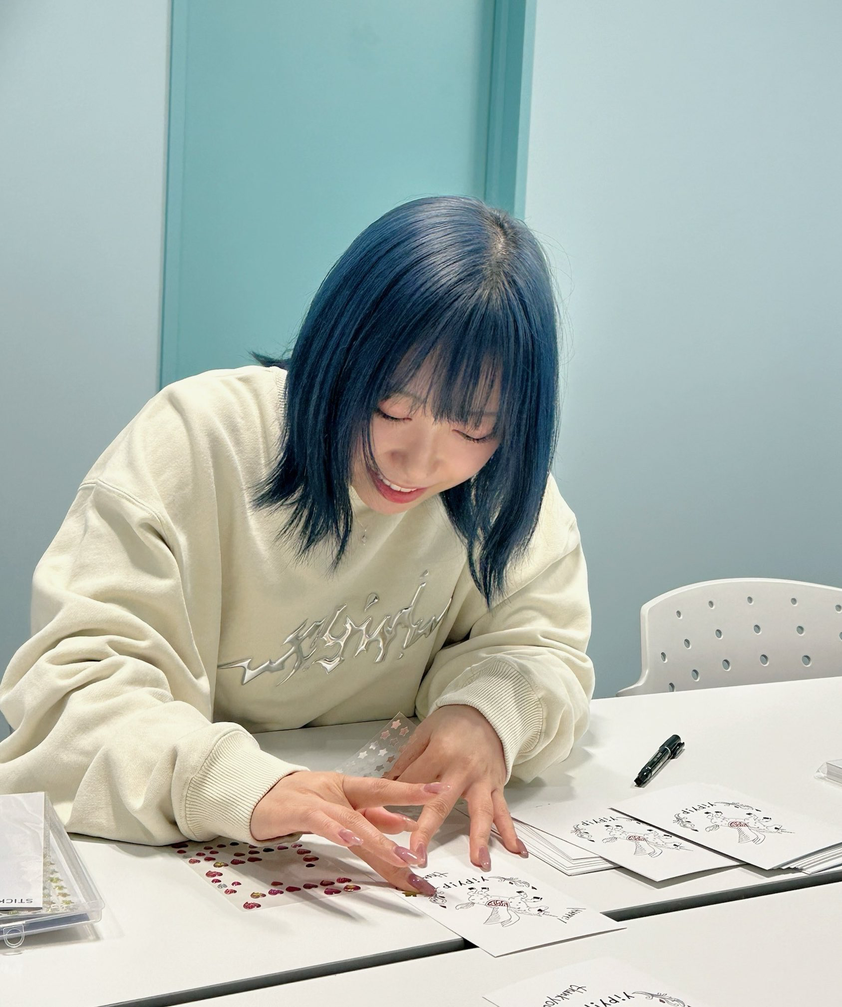 Kyan happily decorating cards for people who buy from her clothing brand :>