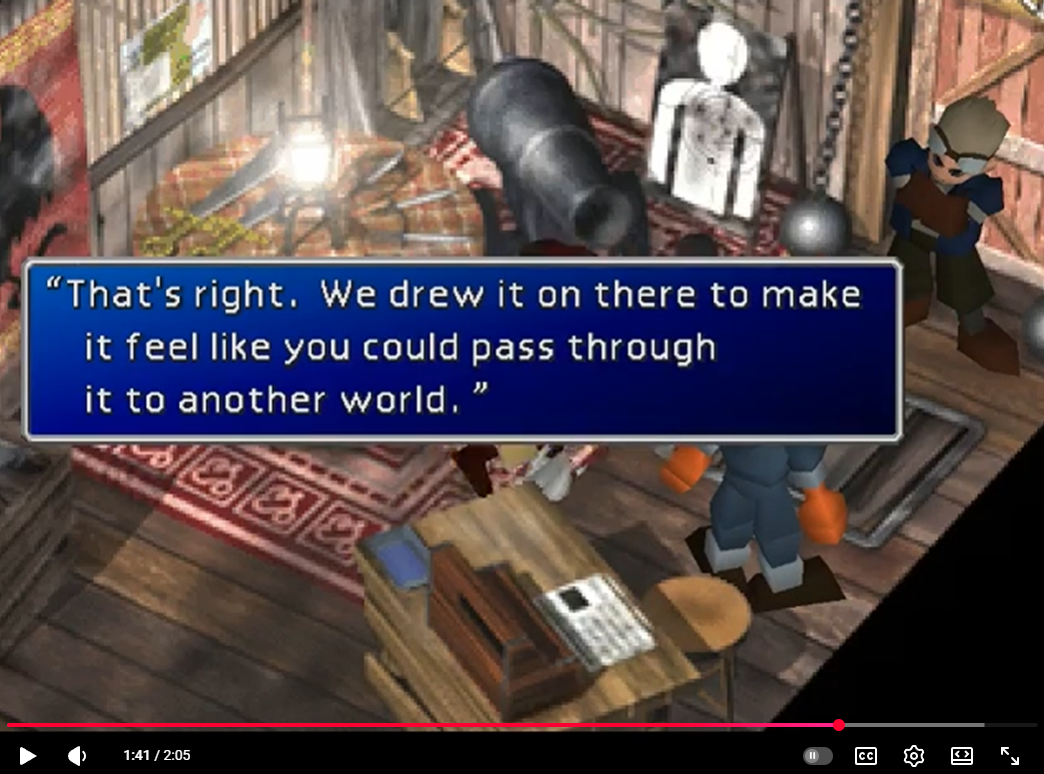 >look man, i've been absorbing hints from HUNDREDS of japanese media which includes games and anime and idol music.>just take pic related as a direct hint in Final Fantasy 7. How do game developers implement "another world" or basically the premise behind isekai, in their videogame? that changes depending on the game, and in Bloodstained's case, the crashes are how the developer chooses to express this world.>The crash in Bloodstained didn't make me think there's more to Bloodstained, it was Bloodborne that made me think that because I saw the giant pile of cut content you can look at yourself here:>https://github.com/Openborne/data/blob/master/fmg/jp/menu/%E4%BC%9A%E8%A9%B1.txt>3,800 voiced lines and dialogue. dismissed as "cut content". it's absurd.>What about IDOL MUSIC? How do japanese idols factor in this equation? Very big akshually. Just take basically this entire song: [YouTube] [Eng/Rom/Jap Sub] Symmetric Generation by nao (embed)>>An exciting parallel land>>Exists just beyond the limits and boundaries?!>it's all of Japan.