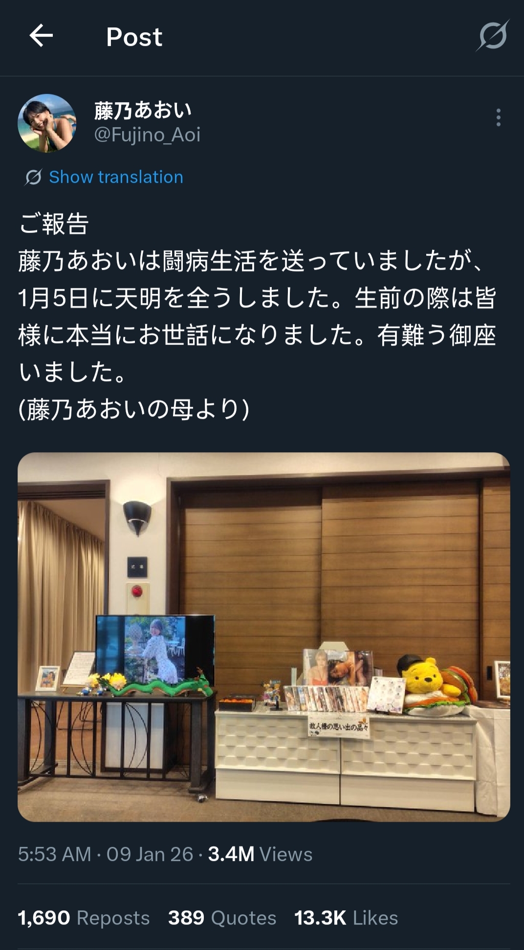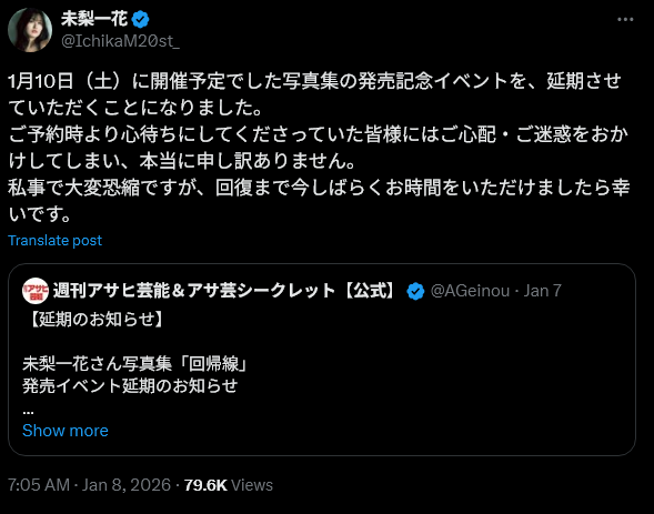 >>50556241https://x.com/IchikaM20st_/status/2009053899312050578Ichika Miri, Fujino's friend, postponed her own PB event (scheduled for January 10) a day before the announcement of Aoi's passing. Was it...?