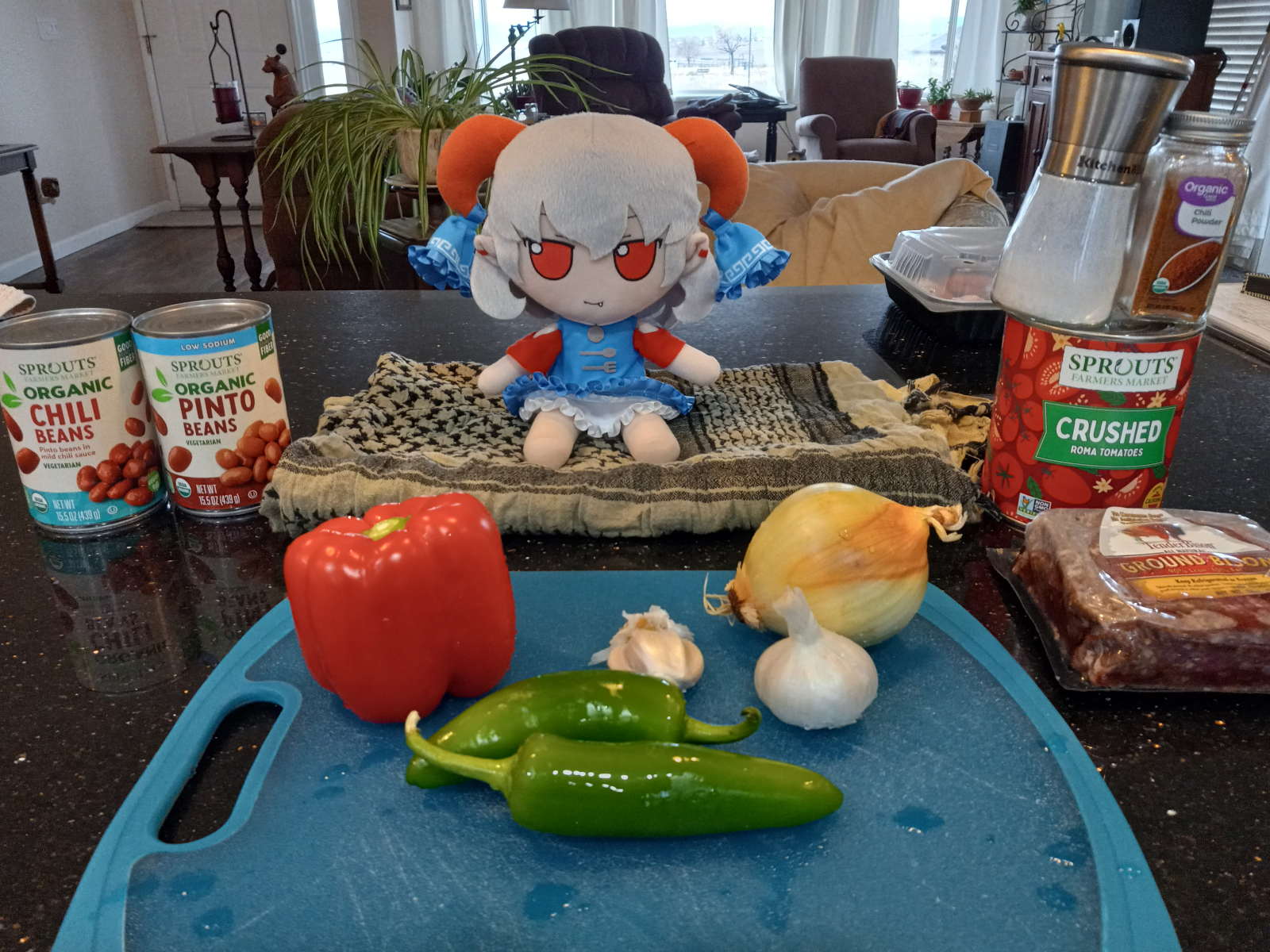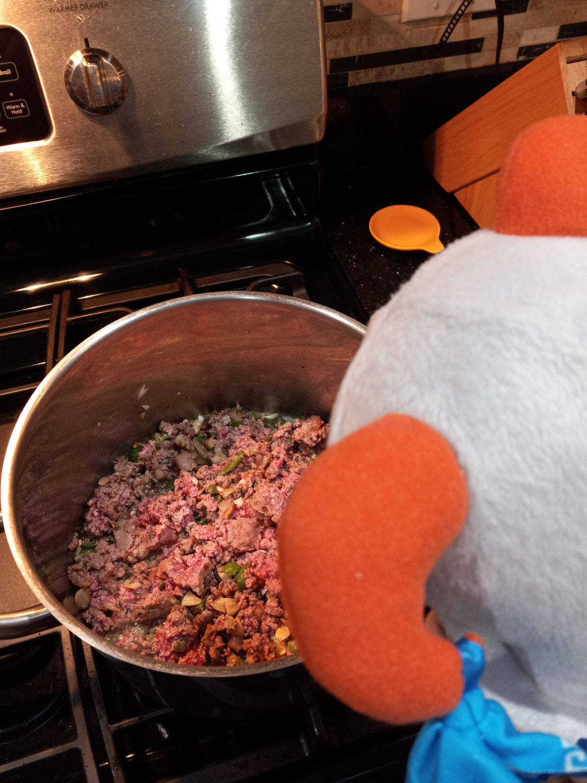 >>506121281/2 c. onion1 & 1/2 cloves garlic1/4 c. pepperboi there (Yuma ate it whole, skipping...)2 jalapenosPounda bisonDiced all the vegs, threw em in the pot with 3 tbsp oil, sauteed a bit, then threw in the bison to brown. Yuma is inspecting my handiwork here.