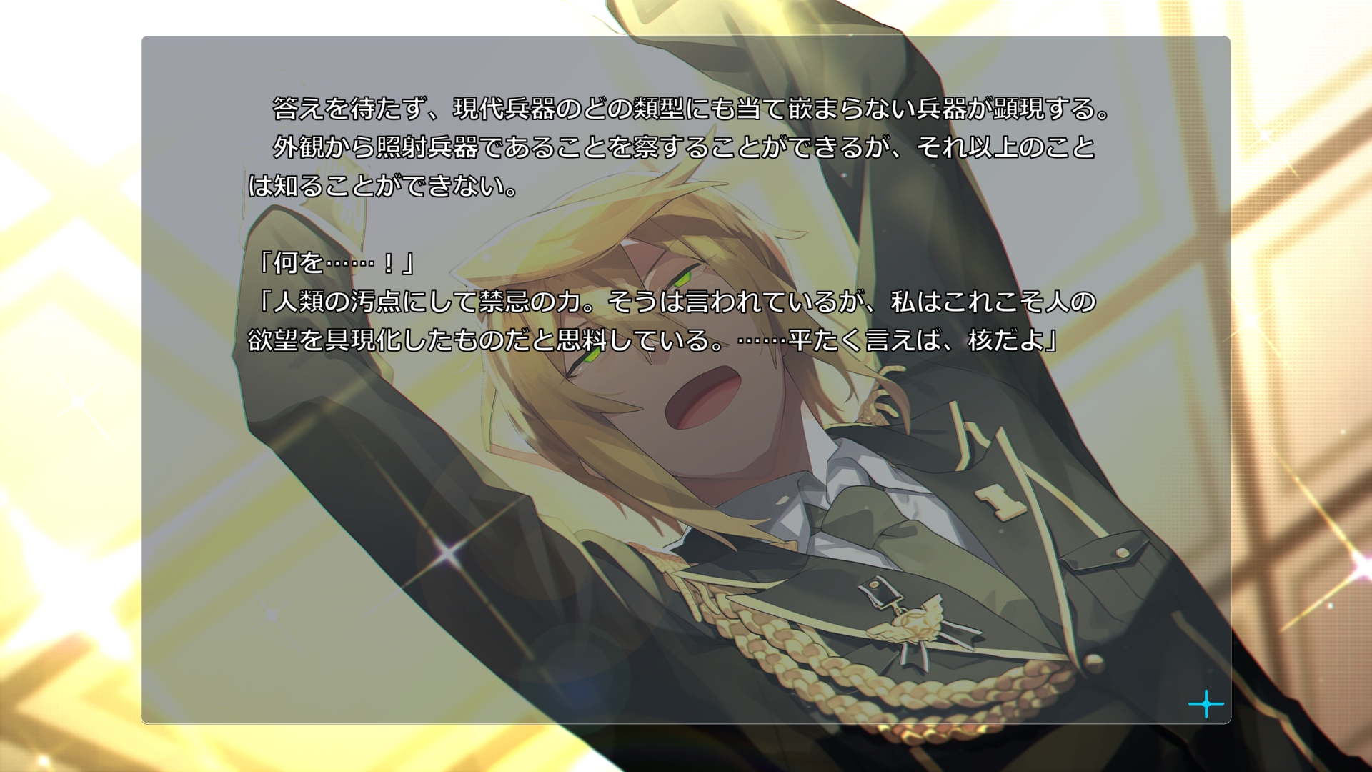 Eve Bethel Souko route spoiler>a fucking nuke, except this time it's in the first route instead of the final battleYeah, Fomalhaut really is another Amakasu. Pretty fun for an introductory route. Having the bro characters suddenly jump into last battle of the route was pretty great, but the setup for it with all the other heroines fucking dying in the middle of the route made it feel like their involvement in the battles might be limited to this route. Hopefully the bros are able to be relevant to the plot later on.