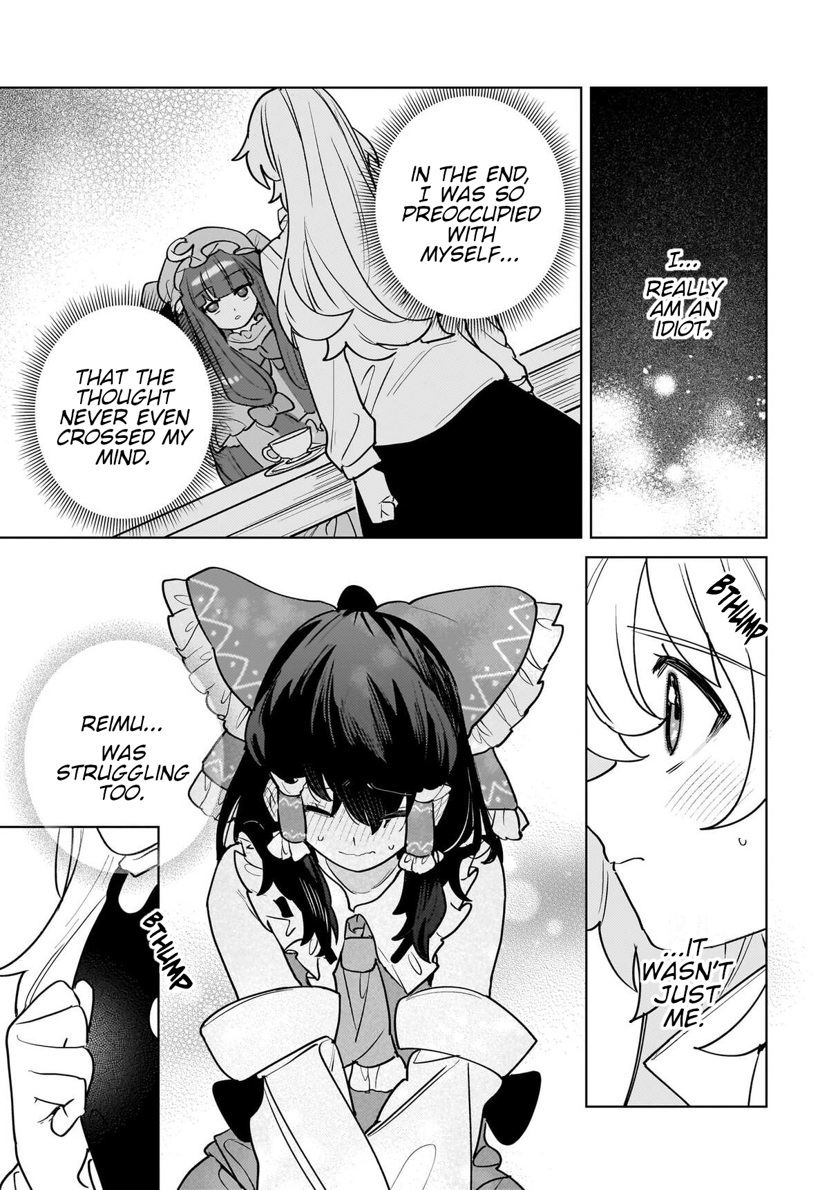 kinda disappointing.reimu got off too easy after telling marisa to shut the fuck up. especially for the second time this chapter.marisa came off as uncharacteristically stupid. what, did she think reimu was an immutable rock for the purposes of komachi's advice? she wasn't ignoring reimu's feelings.i clapped anyways
