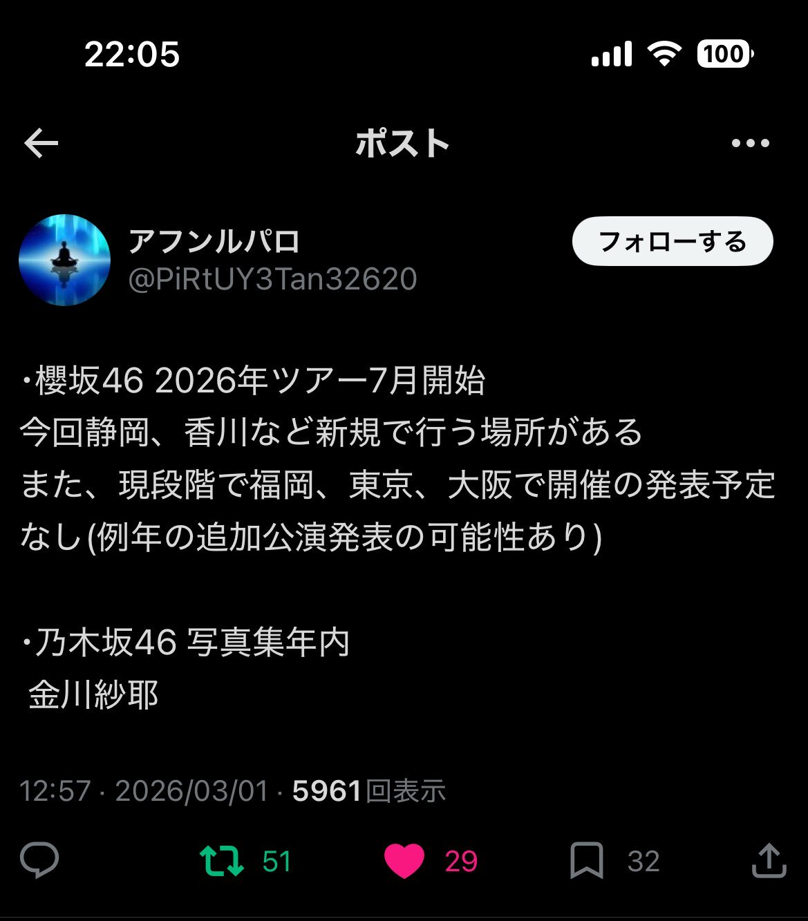 This thread is for the discussion of Nogizaka46, Hinatazaka46, Sakurazaka46, BokuAo, Yoshimotozaka46 (on hiatus), and topics relating to them and their members.>News(02/03/2026) Umezawa Minami 2nd Photobook release(02-03/2026) Okuda Iroha cast member in Musical, "Lady Bess"(03/2026) Tomisato Nao cast in FOD drama "Contrast"(03/11) Sakurazaka46 14th single "The Growing Up Train"(03/28-29) AnimeJapan 2026 @ Tokyo Big Sight (Sakurazaka46)(03/29) BokuAo Spring National Tour 2026 @ KANDA SQUARE HALL (Tokyo)(04/03) CENTRAL MUSIC & ENTERTAINMENT FESTIVAL 2026(04/04-05) 7th Hinatansai Festival(04/04) BokuAo Spring National Tour 2026 @ SENDAI PIT (Miyagi)(04/08) Nogizaka46 41st single (Ikeda Teresa Center)(04/11) Sakurazaka46 5th YEAR ANNIVERSARY LIVE @ MUFG Stadium (Japan's National Stadium)(04/11) BokuAo Spring National Tour 2026 @ FUKUOKA TOYOTA HALL SKALA ESPACIO (Fukuoka)(04/12) BokuAo Spring National Tour 2026 @ BLUE LIVE HIROSHIMA (Hiroshima)(04/14) Kawasaki Sakura 1st Photobook(04/25) BokuAo Spring National Tour 2026 @ ZEPP SHINJUKU (Tokyo)(05/02) BokuAo Spring National Tour 2026 @ GORILLA HALL OSAKA (Osaka)(05/09) BokuAo Spring National Tour 2026 @ DIAMOND HALL (Aichi)(05/19-21) Nogizaka46 14th Year Birthday Live @ Tokyo Dome(06/20) 3rd year BokuAo Anniversary Live @ STELLARTHEATER(09/05) Hinata Fes 2026 Live @ Sun Marine Stadium Miyazaki(09/06) Hinata Fes 2026 Festival @ Miyazaki Prefectural Sports Park(2026/TBA) Akita Rian casts in stage play “紅哭 -KURENAI-” @Tokyo @Osaka @Nagoya (venues TBA)>LinksUpcoming Sakamichi TV appearances: https://pastebin.com/c8tMgEmh48/46 Group subs masterlist: https://docs.google.com/spreadsheets/d/1B1HFVF5iQBgvjDrPnmwfbq0Iz6VvaOmDep0C2x8yoMoSakamichi subbed content: Nogizaka46: https://nogiarea.weebly.com/ | Hinatazaka46/Sakurazaka46: http://keyavids.com/ | BokuAo: https://subs.j-idols.net/subtitles/BOKUAO/48/46 Group live shows: https://docs.google.com/document/d/1JnKp_AEeGUNTNePfY3C3AO4veiVi7frza82lRo44ejQSakamichi H/S: https://senublog.com/?s=完売表 | https://ameblo.jp/seto-kasumi (no longer updated)Nogizaka46: https://www.nogizaka46.com/Hinatazaka46: https://www.hinatazaka46.com/BokuAo:https://bokuao.com/Sakurazaka46: https://sakurazaka46.com/Yoshimotozaka46: http://yoshimotozaka46.com/>Showroomhttps://www.showroom-live.com/campaign/nogizaka46_srhttps://www.showroom-live.com/campaign/hinatazaka46_srhttps://www.showroom-live.com/r/BOKUAOofficialhttps://www.showroom-live.com/campaign/sakurazaka46_srhttps://www.showroom-live.com/campaign/yoshimotozaka46Previous Thread: >>50715746