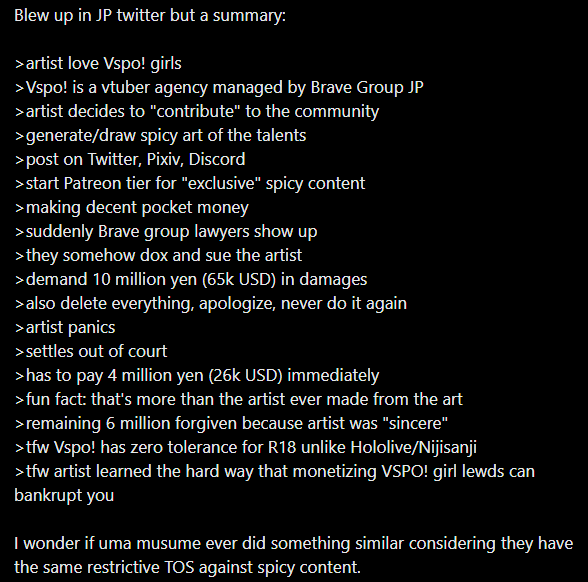 That doesnt happen with cygames and anyone that knows about vtubers knows that VSPO company is a black company and their vtubers are actual schizos