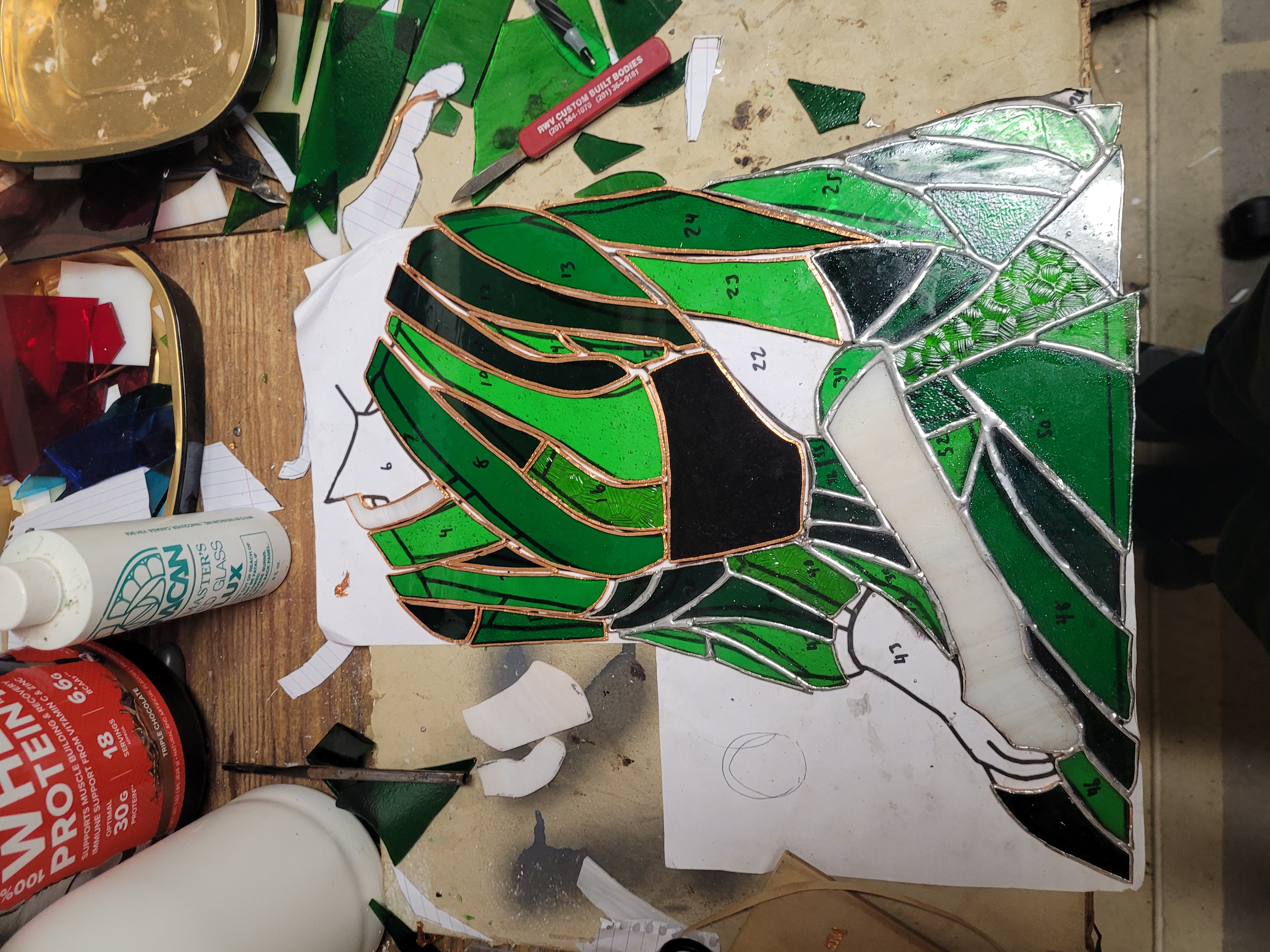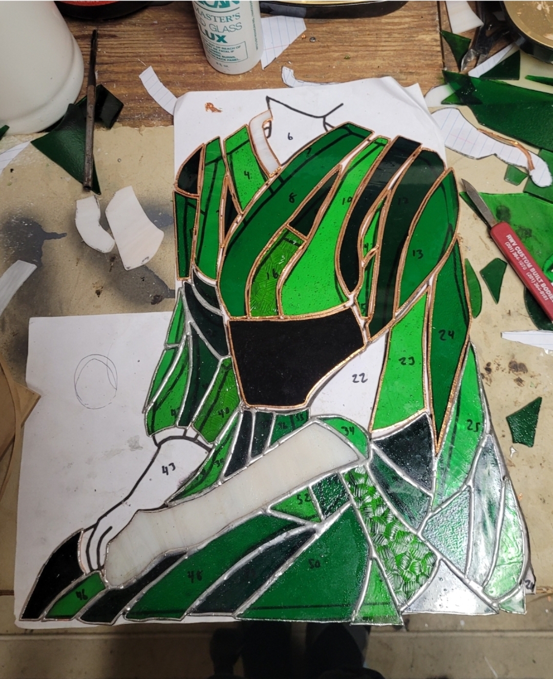 >>50777330I'd argue the phantom's fine, but the bow could have used some work to look a little less blobby. I'd probably have used three pieces of glass and put in the white lines that go against the black of the bow.Obviously I'm not that anon, but I am a stained glass guy (calling me an artist would be a stretch). The bottom half in >>50776678 (the silvery parts) are soldered lead cames and the upper half is copper foil. I expect going off of the fact that I can't see any solder joints that the head is mostly copper foil too, but I might be wrong because this anon is a much cleaner solderer than I am. For lead, after you solder the whole thing (and cement it for stability and waterproofing, but I guess that's not strictly necessary depending on where you put it or what you're doing with it) you polish it with a black polish which buffs up nicely. Not 100% sure on the process for copper foil, but most of my work was with lead.Anyway, >>50776741, it's still a pretty impressive piece and I commend the effort you put into it. Hope you can get back to the workshop and do some more someday.