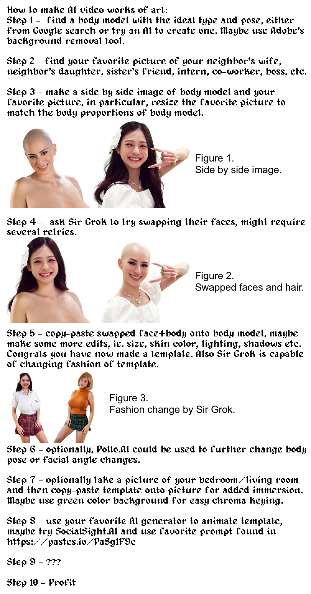 How to make AI video works of artStep 1 - find a body model with the ideal type and pose, either from Google search or try an AI to create one. Maybe use Adobe's background removal tool.Step 2 - find your favorite picture of your neighbor's wife, neighbor's daughter, sister's friend, intern, co-worker, boss, etc. Maybe use Adobe's background removal tool.Step 3 - make a side by side image of body model and your favorite picture, in particular, resize the favorite picture to match the body proportions of body model.Step 4 - ask Sir Grok to try swapping their faces, might require several retries.Step 5 - copy-paste swapped face+body onto body model, maybe make some more edits, ie. size, skin color, lighting, shadows etc. Congrats you have now made a template. Also Sir Grok is capable of changing the fashion of template.Step 6 - optionally, Pollo.AI could be used to further change body pose or facial angle changes.Step 7 - optionally take a picture of your bedroom/living room and then copy-paste template onto picture for added immersion. Maybe use green color background for easy chroma keying.Step 8 - use your favorite AI generator to animate template, maybe try SocialSight.AI and use favorite prompt found in https://pastes.io/PaSg1F9cStep 9 - ???Step 10 - Profit