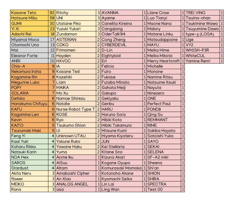 >>50767161>1 Kiyoteru>1 Miki>1 Mayu>1 Ritsu>several whotaus>2 hxvoc>No Galaco, Yohio, Sonika, Big Al, Avanna, Lily, or many other loids that used to have at least some use>92 TetoI hate newgen vocaloid