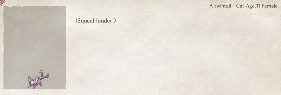 >>50807315You don't get it. Ratkins (and bunnies) need to be added first, so that cats (and Catgirl) characters are automatically always 'hostile' to them and will run up to them and crowd around them like as if you have some Churyu on you, except they'll occasionally take a free 'non-hostile' swipe at them or throw rocks at them