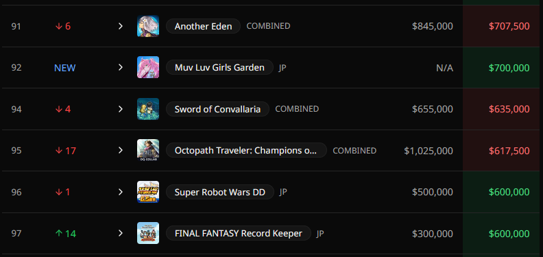 >>50813813The meme PVP gacha everyone uses in /vg/ to fling shitI imagine they're speculating/making up iOS/Android numbers for Muvluv>>50812919Yeah I see Legeclo in there too. Weird that they're there when English communities for these games are nearly nonexistent, I wonder how the gacha tribalists even noticed these games exist.