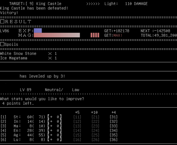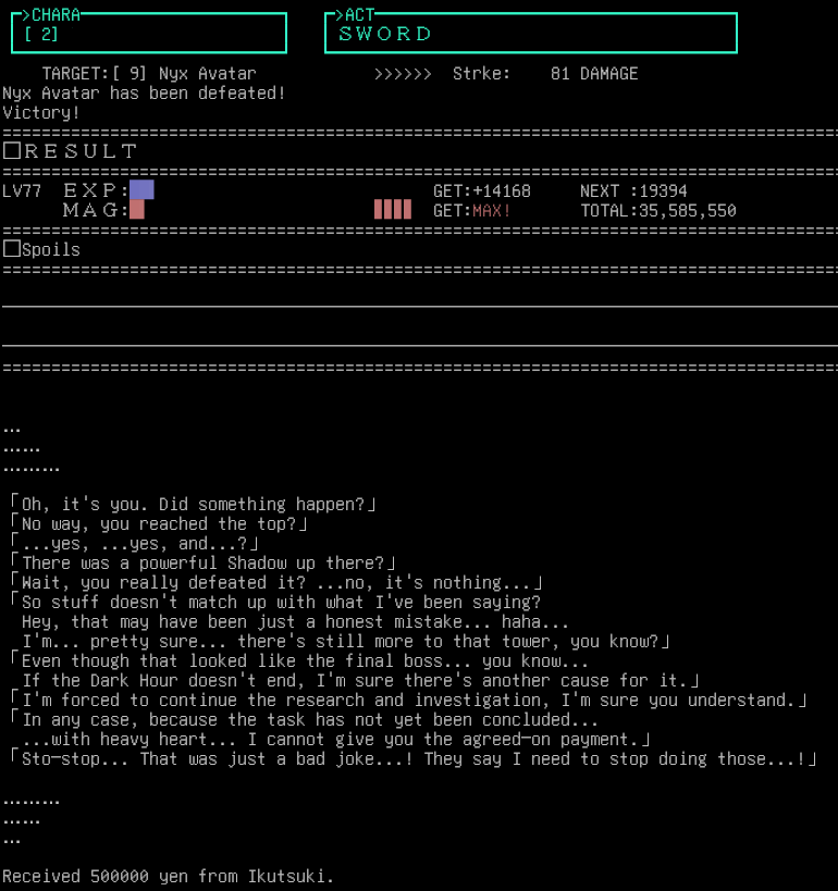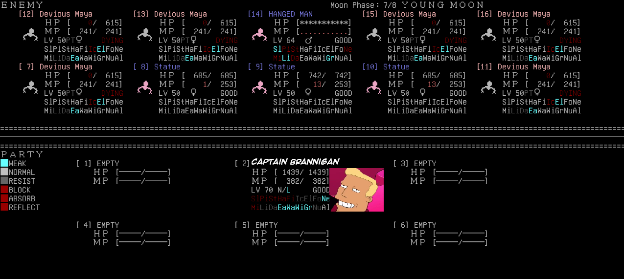 managed to solo one of those fuckass powerful shadow parties in tartarus's basement. was struggling to get even 1k exp after normal fights so i'm very glad it's doable. still need to beat erebus on floor 5. pretty spooky because they nearly 2shot me but they ran out of MP before I did even spamming mediarahan since they don't have boss-tier MP reserves.
