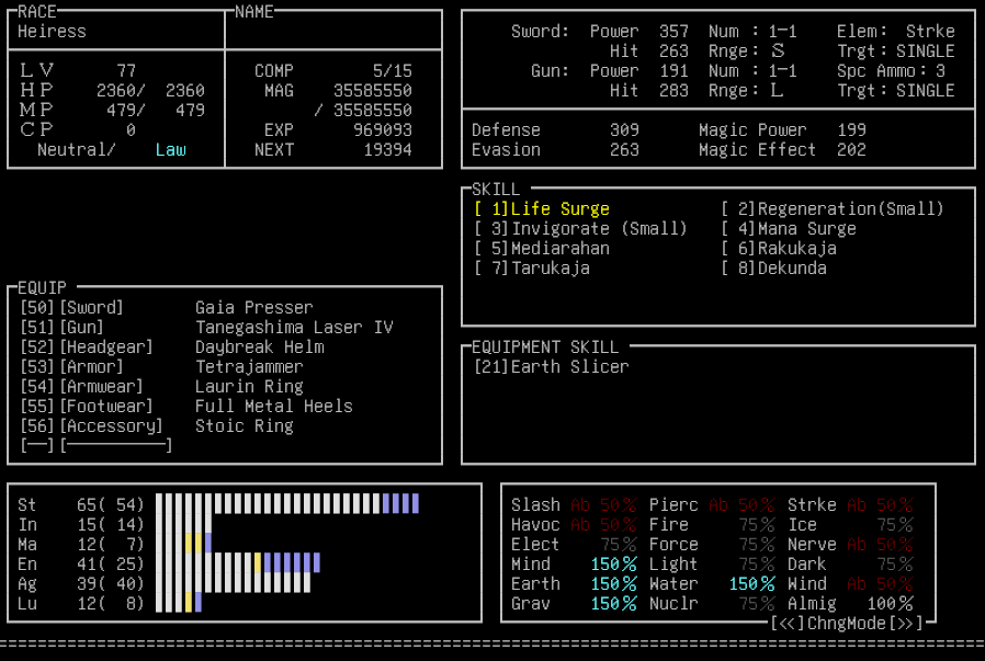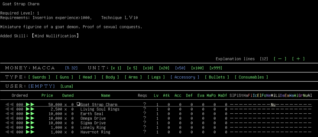 >>50821875megiolaon isn't the problem whatsoever. it's any 3+ of nerve, mind, earth, water, wind, and gravity, since i can only turn 2 of them into absorptions for any 1 battle. not to mention any status effects like brand, stone, or anything else if I can't do mind or nerve. and since i can never outlevel her, i don't know how i'll ever be able to tank her party long enough to deplete their MP. although, if i do a training first, i'll have access to functionally infinite macca/cash. so maybe there's some combination of bullshit in one of the stores that could do the trick? i doubt it though.