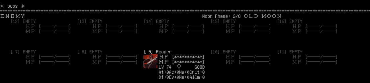 pretty often with this solo challenge i'll end up softlocked in a position where i can neither win nor lose. usually because the enemy is a cheating bastard who can use MAG-dependent skills for free has regeneration and i simply can't out-damage it. in this case, with +8 atk, i'm dealing ~35 damage per hit to an ouroboros. and i need to deal... more than 180 damage per turn.
