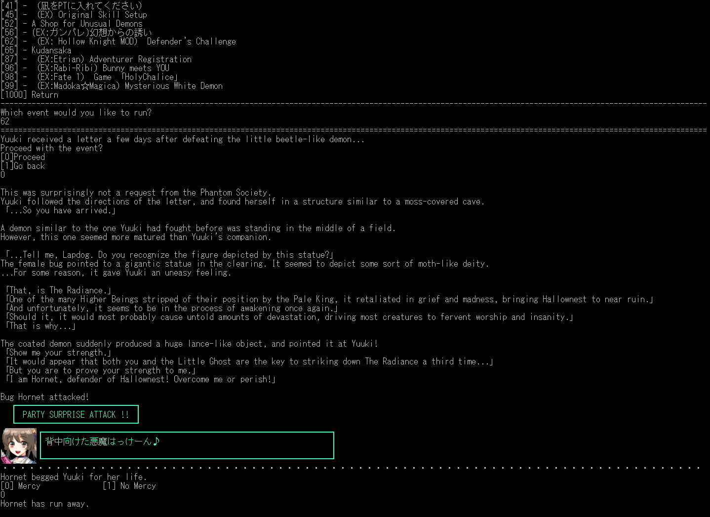 Ribbon SP defeated, solo, day 1.>Grinded Tartarus until I could get level 50 gear since my survivability just wasn't good enough otherwise>Buy best fist weapon (Str+End mastery) for more accuracy/damage>Full set of Crimson Armor for innate Life Surge>Fire & Wind absorptions>Always defend when nuclear/flame resistances are negated to avoid getting BRAND or FLAME>Mediarahan only when below 200 hp to conserve MP>EVENTUALLY whittle down her MP to 0 after 10 minutes of balancing HP & MP on a tightrope>she doesn't regenerate MP>easily punch her into oblivion once she's stuck with basic attacksWhat will the bunny's punishment be for such a troublesome boss fight?[0] Give her a light punishment(Joins with a small of amount of sexual experience)[1] Help her recover(Joins with the Trust state)