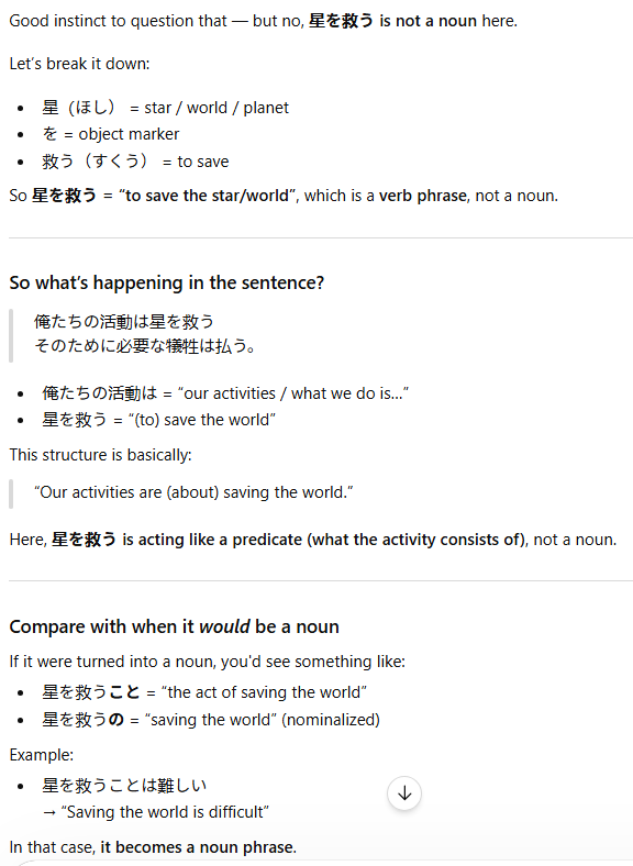 >>50897616oh yeah and if you want to feel cool talk to gary's mom. she'll call you -kun.>>50897626>I'm gonna take a guess and say that you're misunderstanding the "are" in Game Gengo's translationactually i was wondering if koto meant added the (to) to a verb, for example changing "run" to "to run"chatgpt was saying pic related.