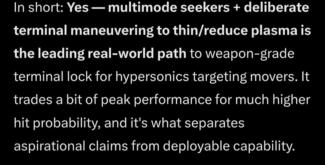 >>64775426EO/IR can see Albert degraded through the plasma sheat, higher radar frequency like Milimeter radar can pass through.Gps can pass through so you guide the missile in the general direction of the carrier, then have it manuever to lower temperature to increase accuracy.