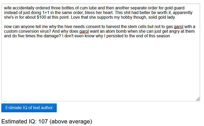 wife accidentally ordered three bottles of cum lube and then another separate order for gold guard instead of just doing 1+1 in the same order, bless her heart. This shit had better be worth it, apparently she's in for about $100 at this point. Love that she supports my hobby though, solid gold lady.now can anyone tell me why the hive needs consent to harvest the stem cells but not to gas garol with a custom conversion virus? And why does garol want an atom bomb when she can just get angry at them and do five times the damage? I don't even know why I persisted to the end of this season