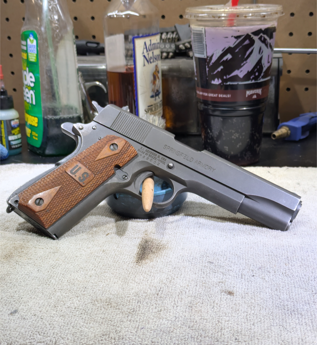 Next up I got my Springfield 1911 A1, built sometime in 2006. Shes my pillow gun, i keep her ready to rock with 2 mags. Said mags are loaded with 5.1gn of win 231, and 230gn hornady xtps. Bigger holes more better, yeah? Also, muh stoppin powah, two world wars, etc.