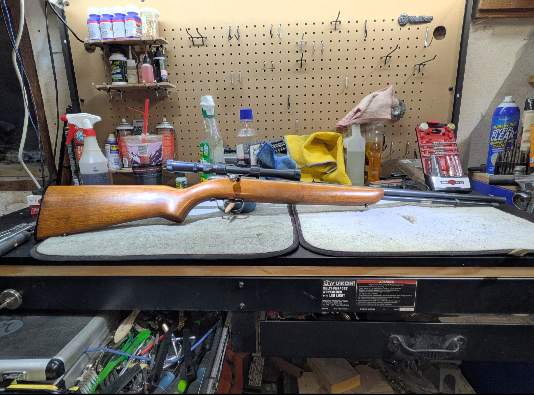 Next up is one of my favorites in my arsenal: A Remington Sportmaster 512, tube mag, in 22 short, long or lr. She was the first gun my gramps ever bought with his own money, built in december 1940 or january 1941.Gramps had a 3/4 scope mounted to it, but the wires went funky on me somewhere. Got a cheap $20 tasco from walmart on it now.I stripped and refinished the barrel and receiver last year with one of those birchwood casey kits, and im pleased with the look. I wanna redo the stock with a kokopelli on it, havent decided what route to take.