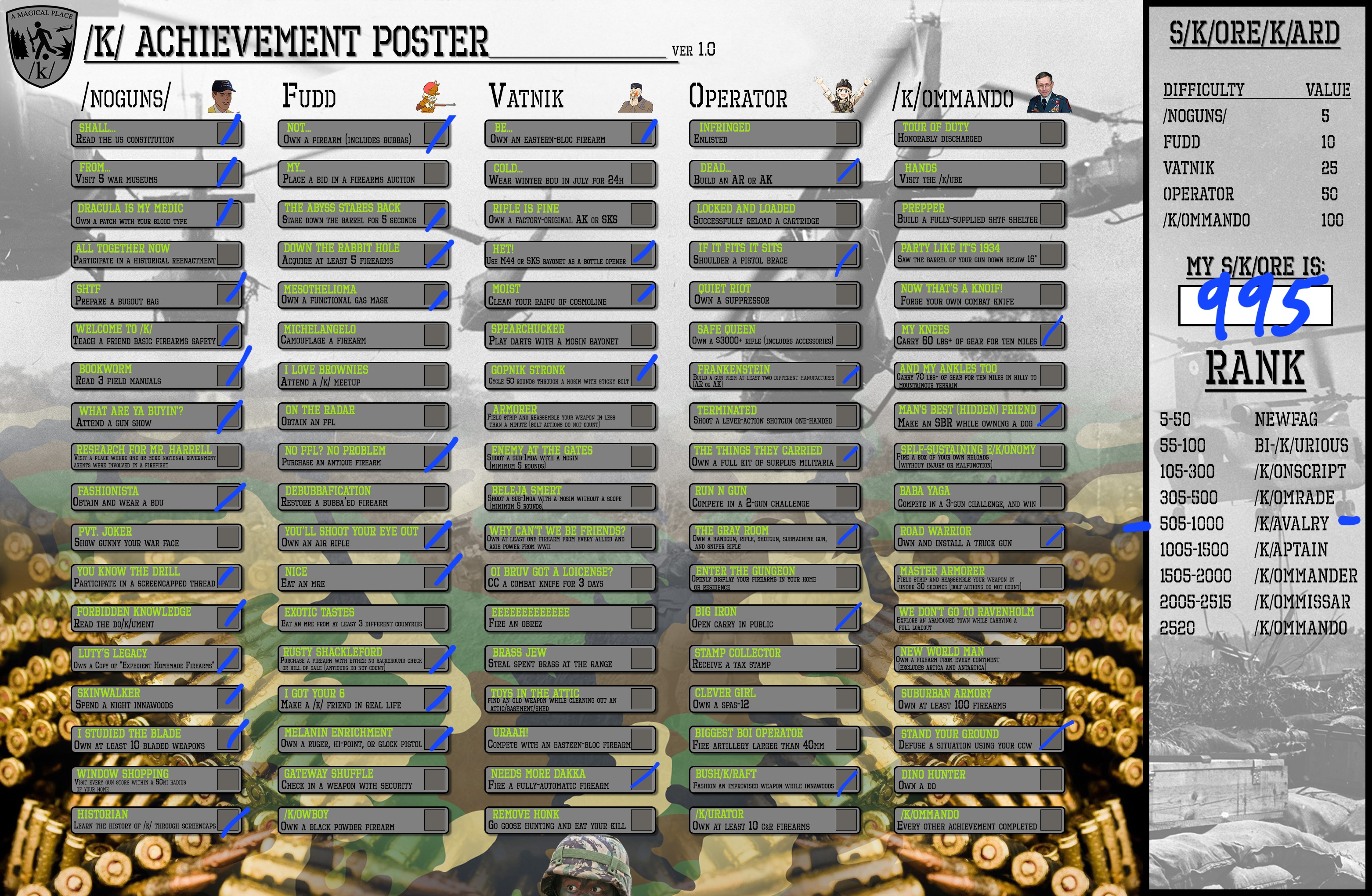 It's that time of year /K/ommandos! Were we reminisce the years that have past and look forward to the new one that is now unfolding! And that includes thinking up of goals for ourselves to achieve this year! You have been thinking of how to become a better /K/ommando right anon?Anyway, I haven't seen one of these threads in a few years, so lets get one going. How do you rank against your fellow /k/omrades?Bonus points if you can add stories about your achievements. Also maybe its time to update the board? Add a few more,