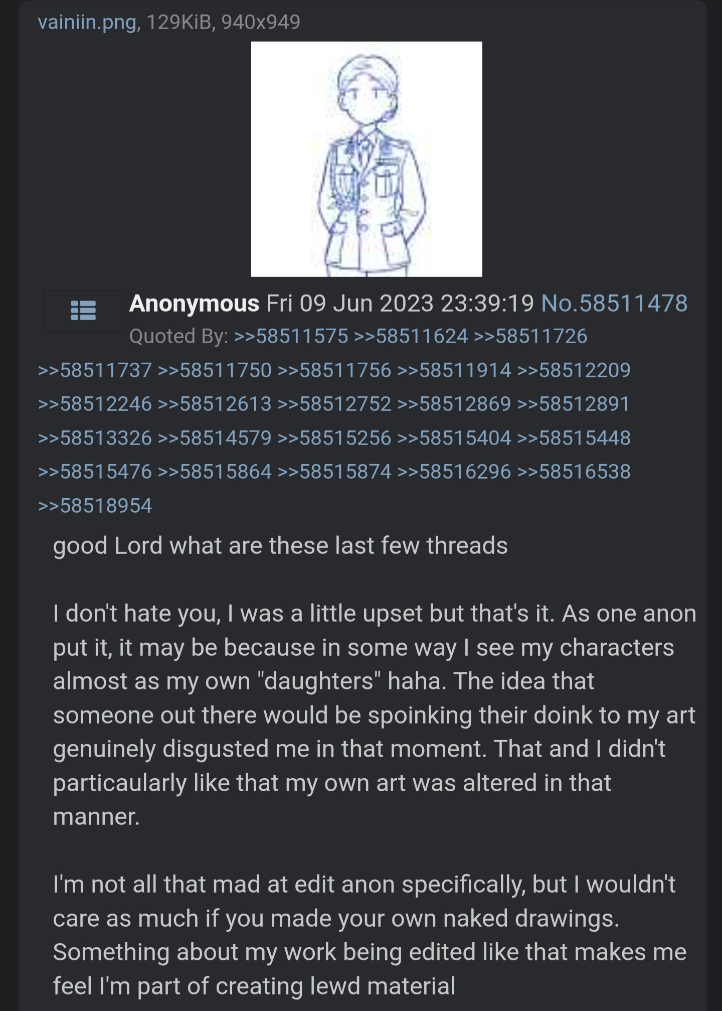 >>64682984>pic related>>64683066No real controversy, just a poor word choice on my end. I meant to say that us posting lewd edits of his art prolly contributed in some small amount to him not wanting to post public art anymore.