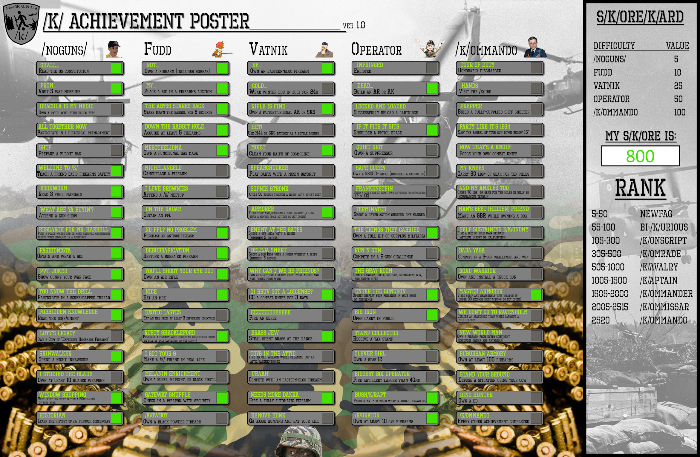 It's that time of year /K/ommandos! Were we reminisce the years that have past and look forward to the new one that is now unfolding! And that includes thinking up of goals for ourselves to achieve this year! You have been thinking of how to become a better /K/ommando right anon?Anyway, I haven't seen one of these threads in a few years, so lets get one going. How do you rank against your fellow /k/omrades?Bonus points if you can add stories about your achievements. Also maybe its time to update the board? Add a few more,